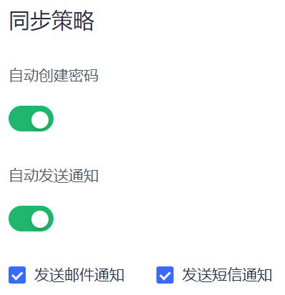 Authing 支持管理员自定义是否启用 自动发送通知。启用后,同步中心导入用户时(仅针对首次创建的用户),自动发送通知。默认同时开启邮件通知和短信通知。