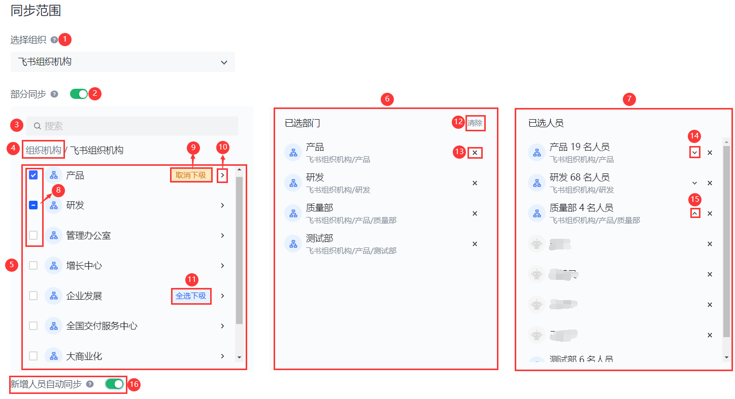 | 16 | 新增人员自动同步开关 | 开启后,选中部门内的新增人员将自动加入同步范围。默认关闭。 |
