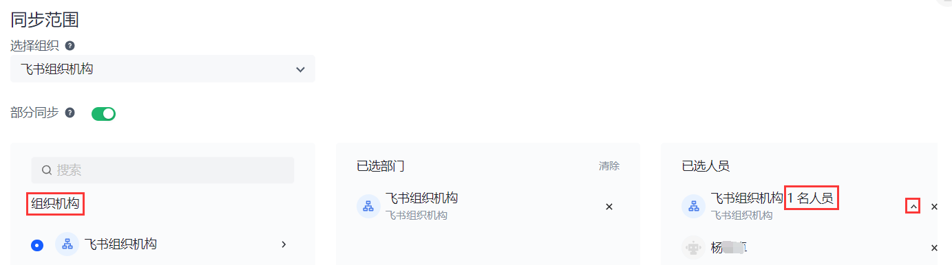 打开 部分同步 开关后,选择框 默认展示组织机构顶级部门的直属人员及一级部门。可在 选择框 选择待同步的部门和人员。