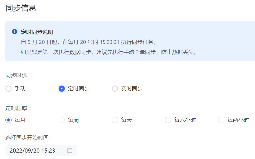 定时同步支持 每月、每周、每天、每六小时、每两小时 执行。设置定时同步,除了需要设置 定时频率,还需 选择同步开始时间。