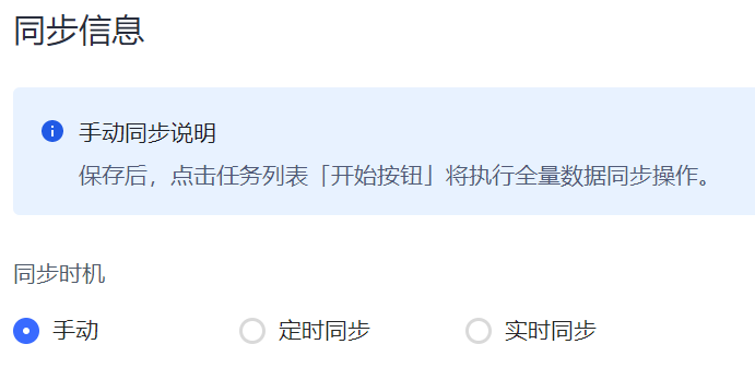 通过手动点击 执行同步任务 按钮的方式执行同步任务,手动同步的特点是 全量、点击即执行。