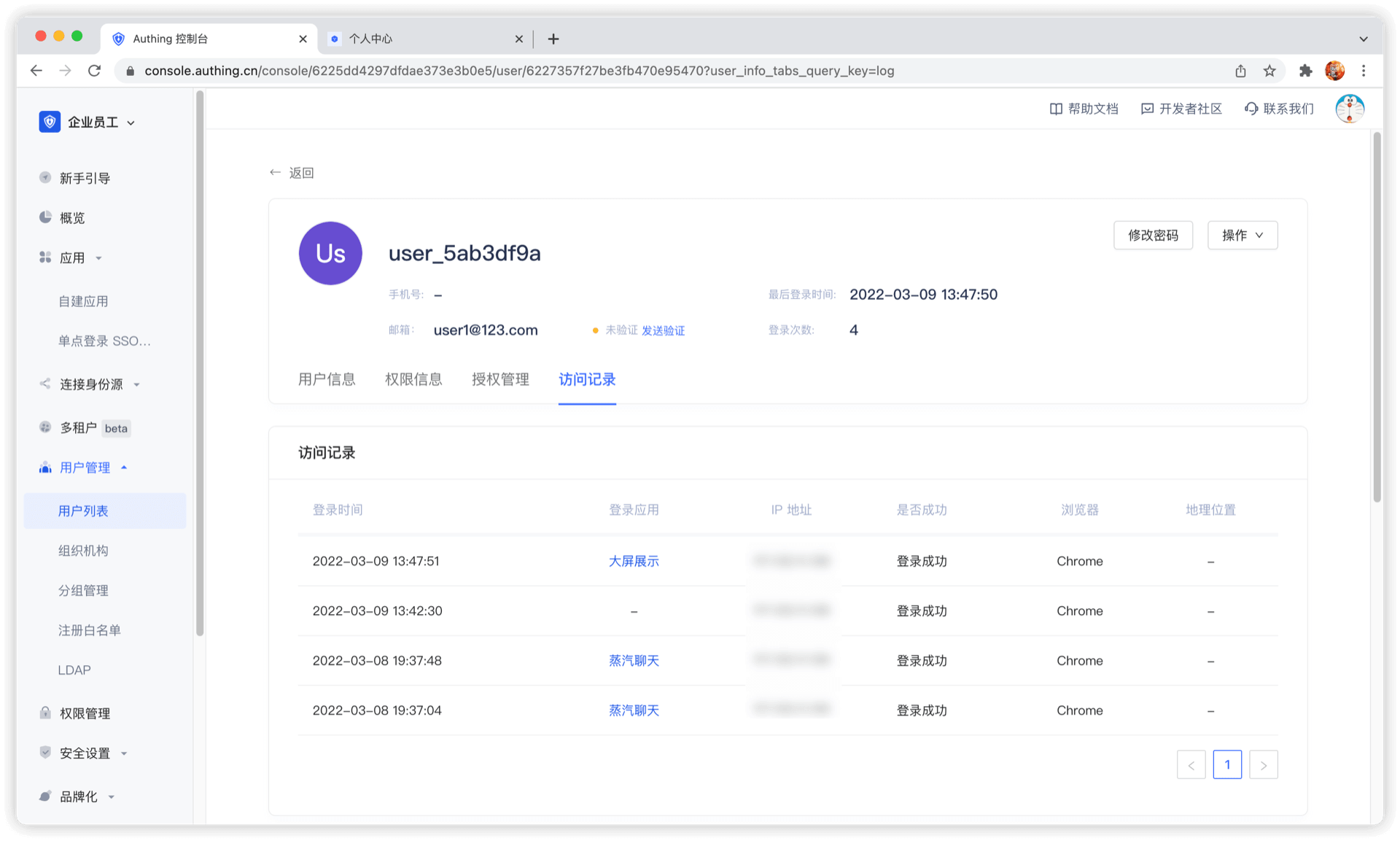 可以查看登录时间、登录应用、IP 地址、登录是否成功、浏览器、地理位置等信息。