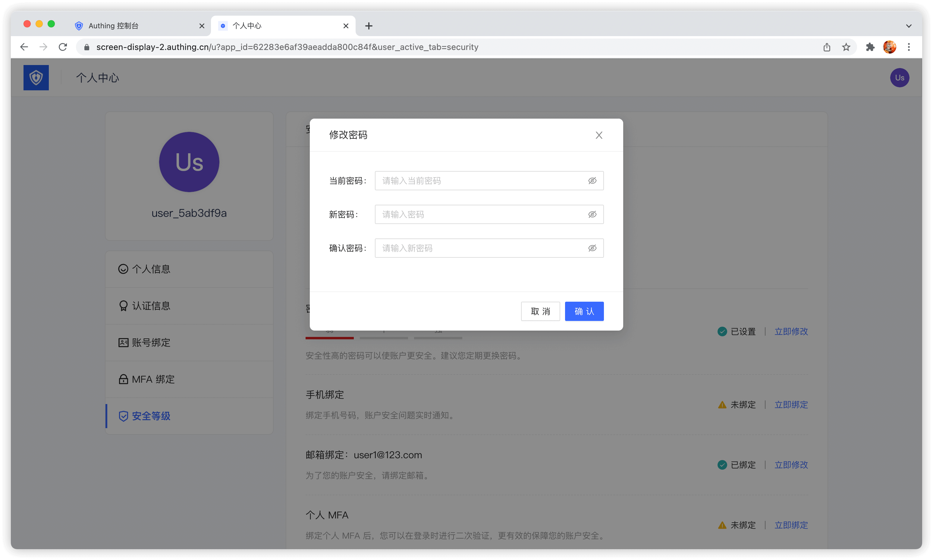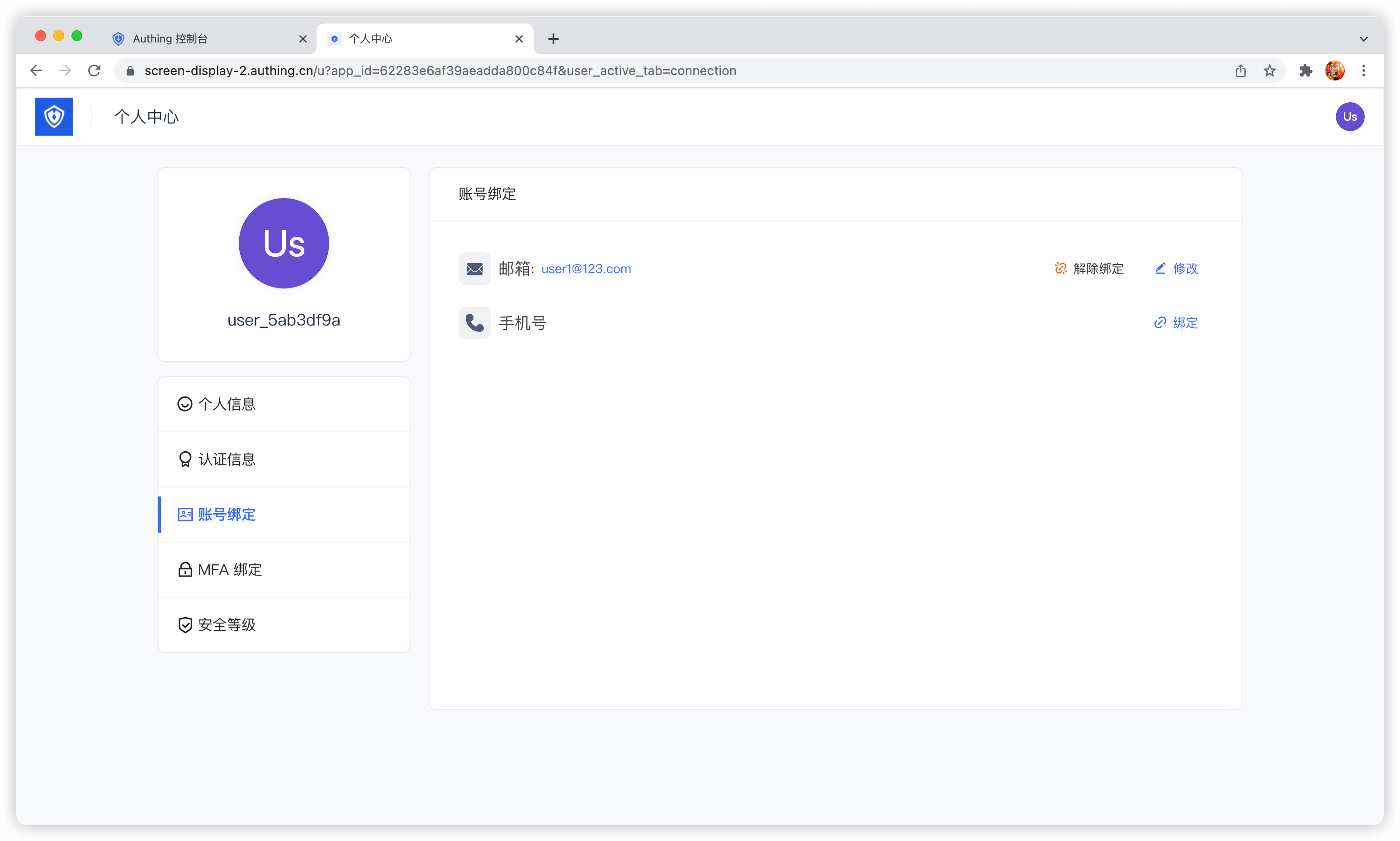 终端用户可以在个人中心的 MFA 绑定 Tab 中绑定 MFA: