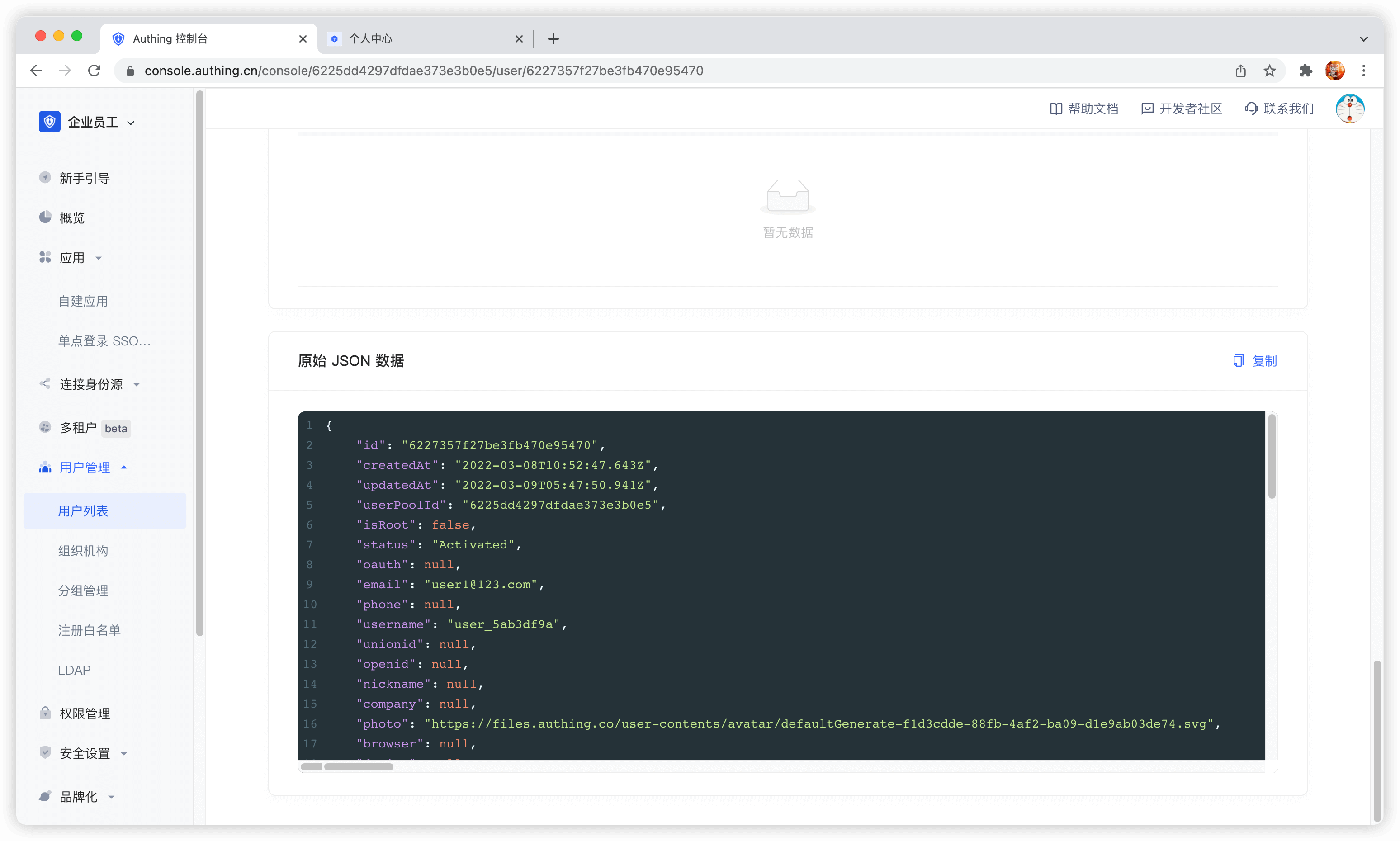 以及一个用户个人中心,你可以在此体验 (opens new window),地址为 https://<YOUR_DOMAIN>.authing.cn/u: