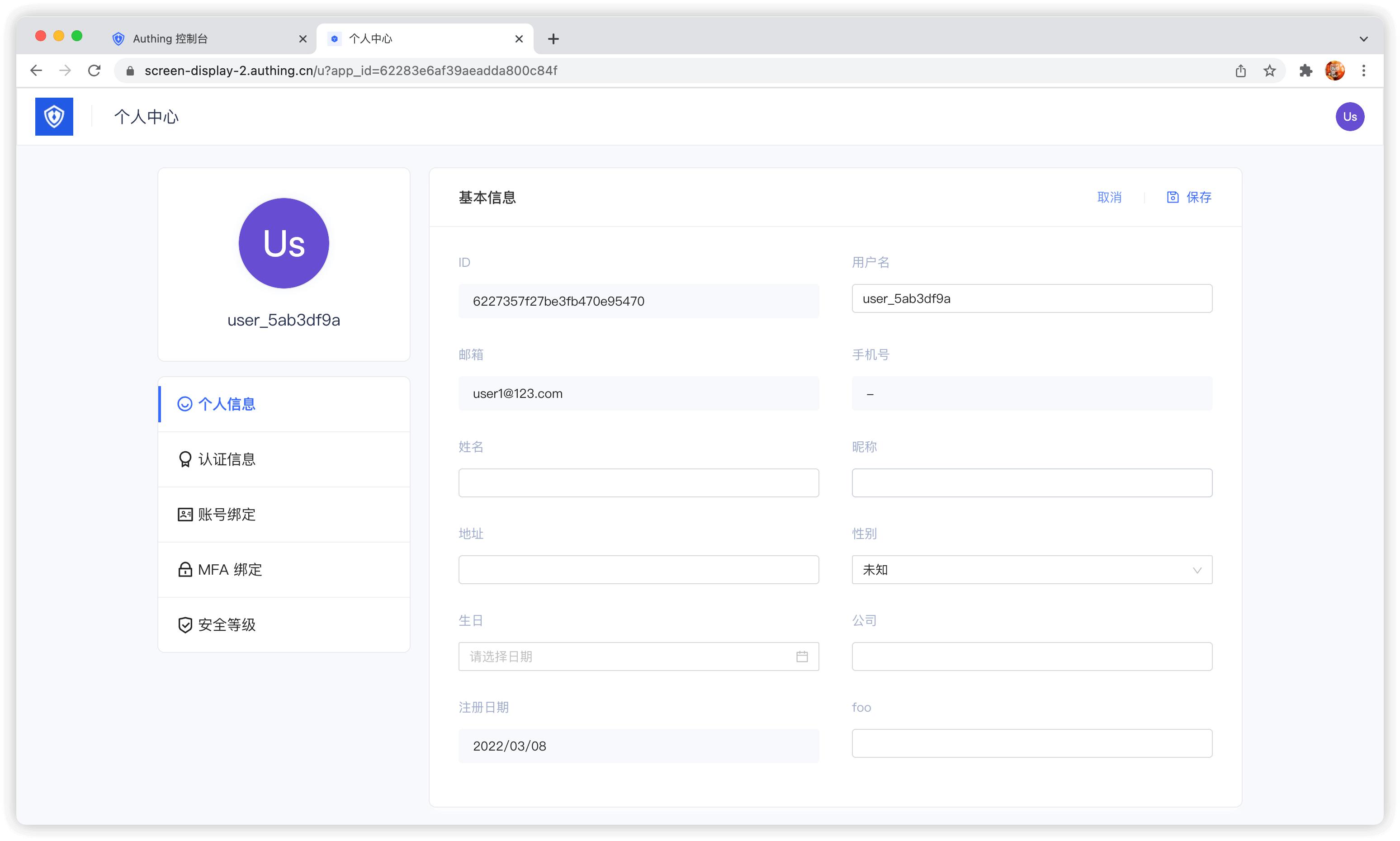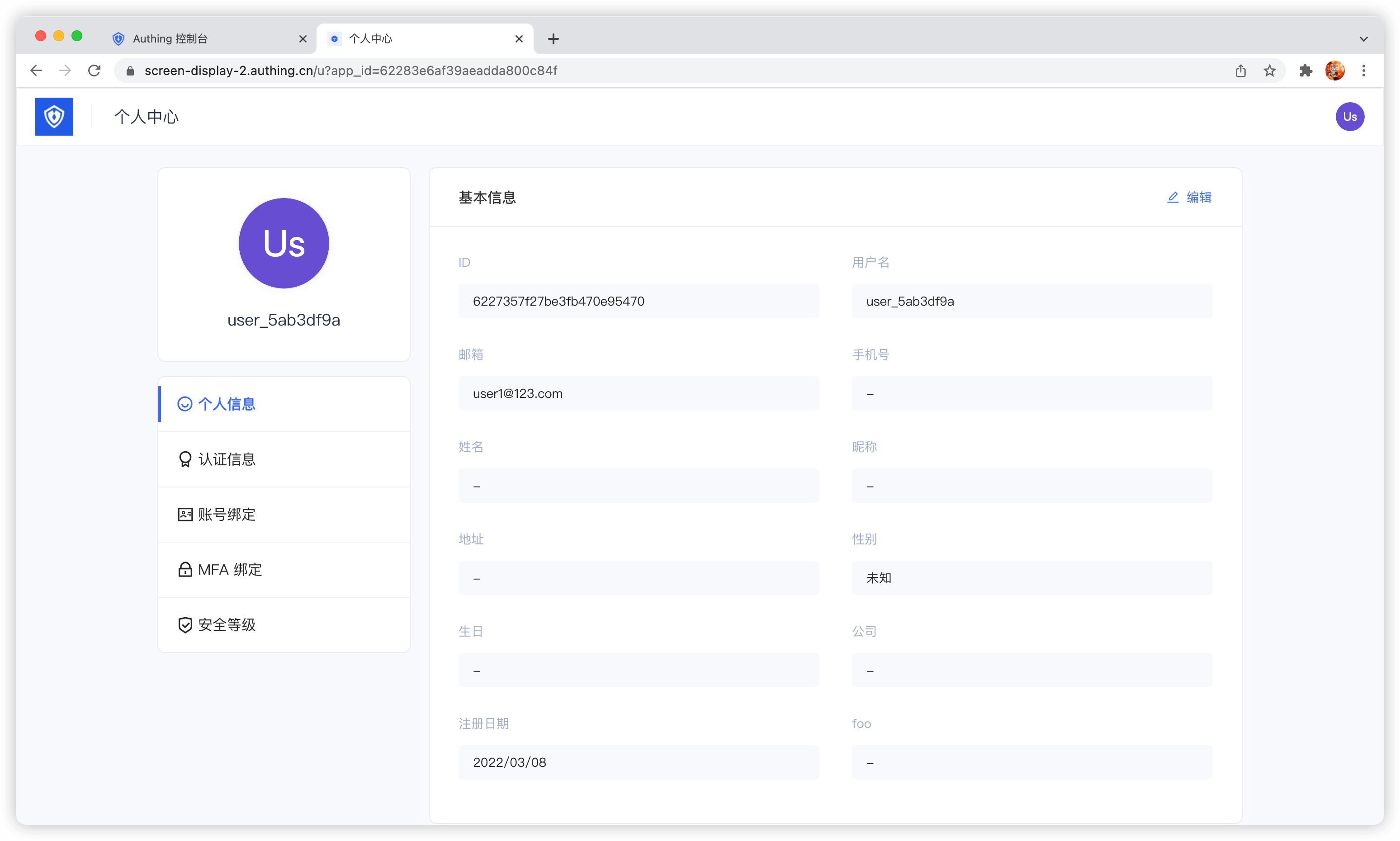 Authing 提供了一个内置的用户个人中心页(地址为 https://<YOUR_DOMAIN>.authing.cn/u),可以完成用户基本信息的修改: