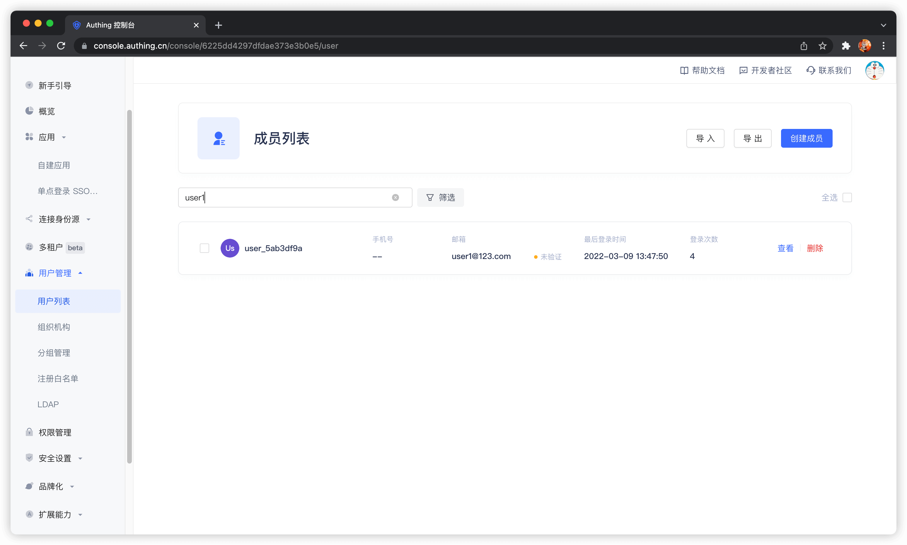 Authing 支持通过邮箱、用户名、手机号、昵称等字段对用户进行模糊搜索,且同时支持控制台和 SDK 两种模式: