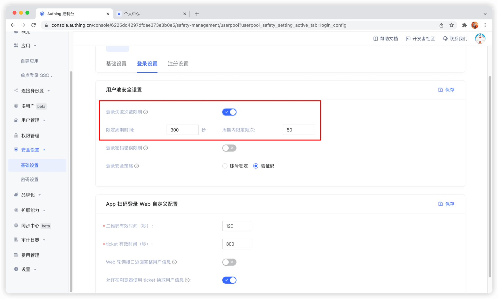 你可以在控制台的 设置 - 安全信息 中开启 登录失败次数限制 开关,限制 同一账号 在多少秒内不能超过多少次失败登录: