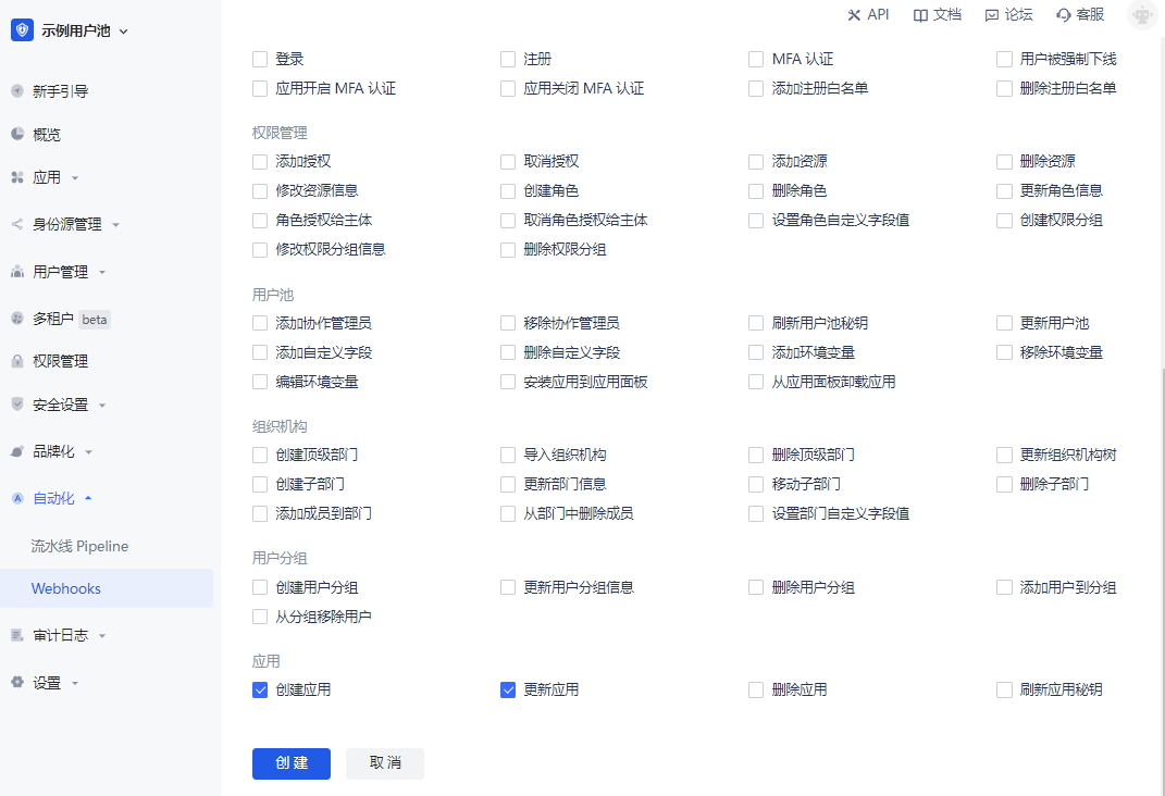 有关支持「Webhooks」功能权益的 Authing 用户池版本信息,请查看 官网「价格」页 (opens new window)。如你的版本不支持此权益,且想试用,可开通体验期。有关体验期介绍及开通方式,请查看 体验期。