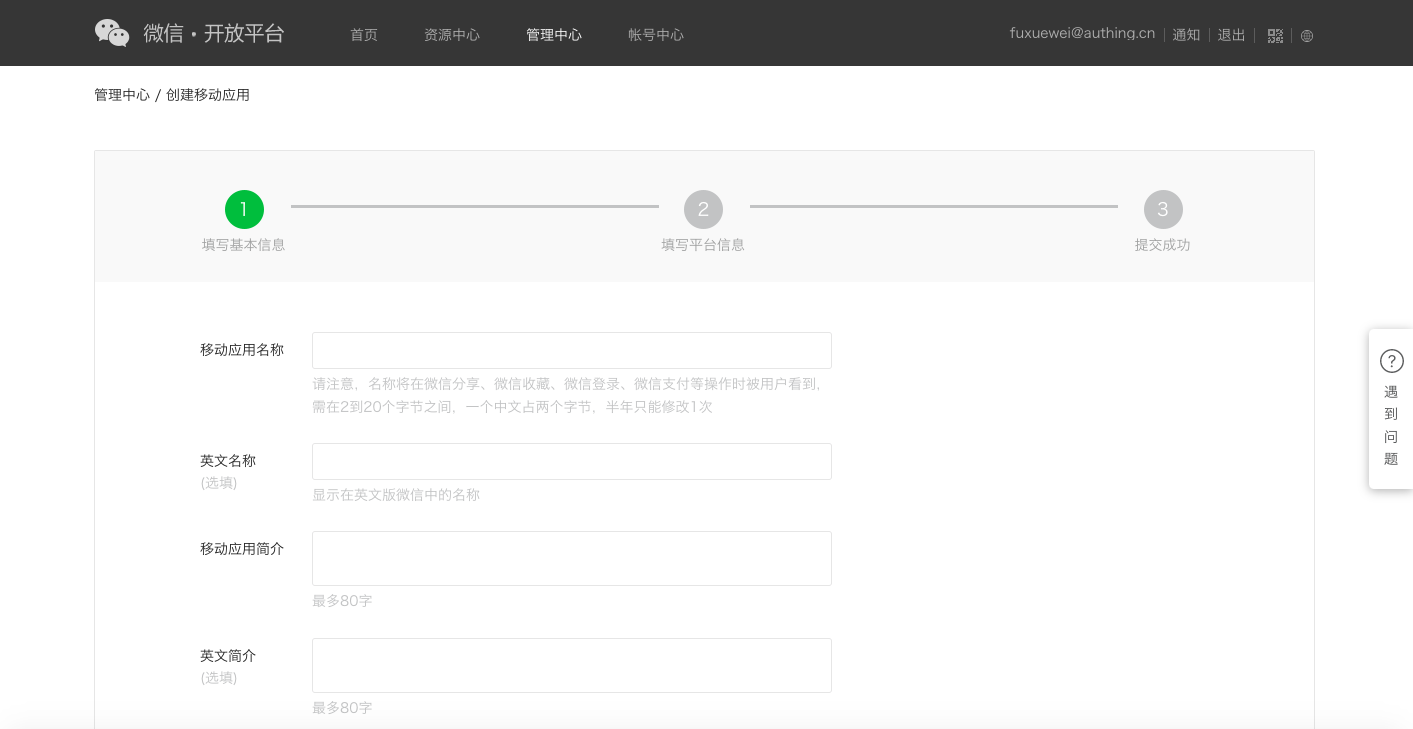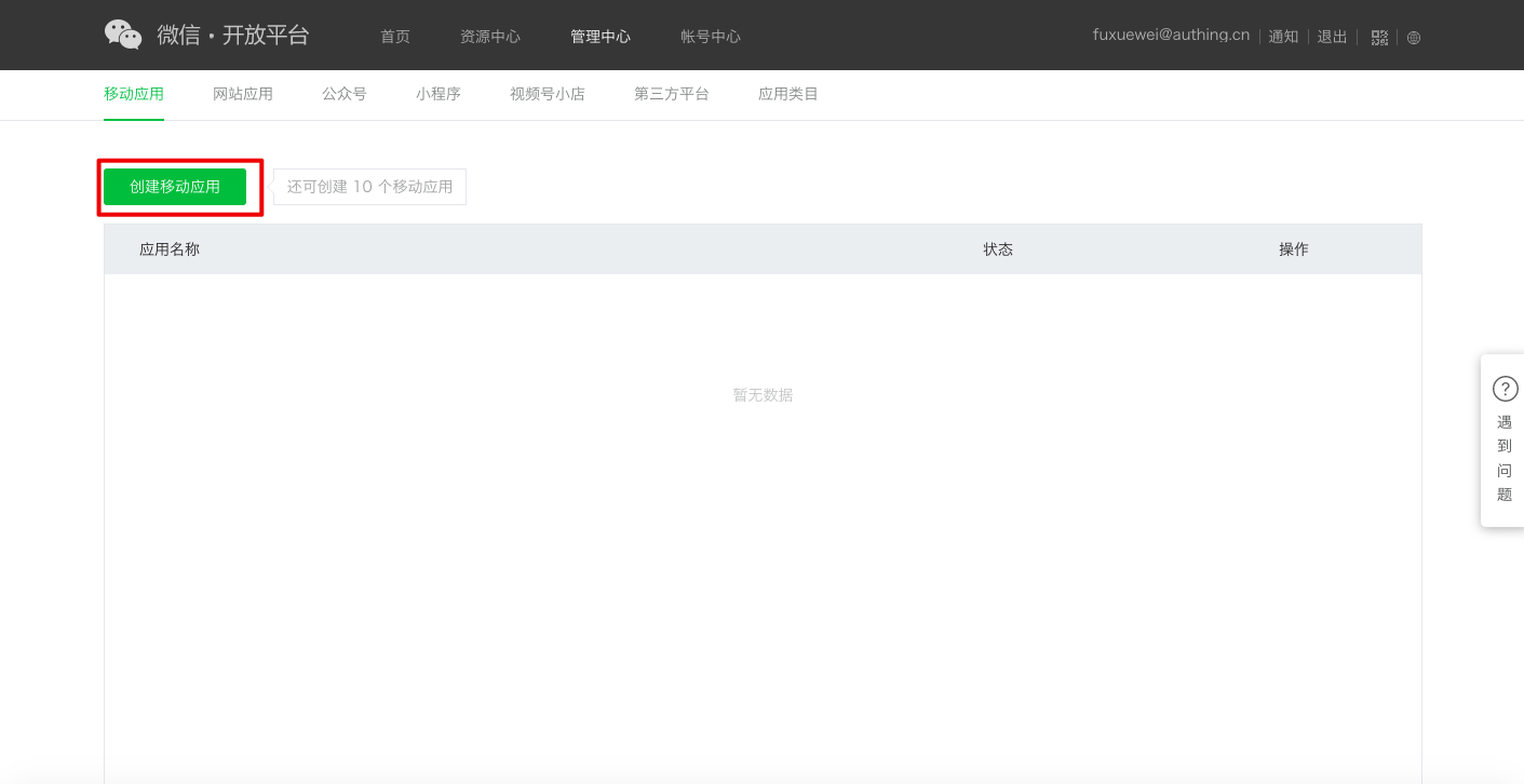 - 登录你的 微信开放平台 (opens new window) 后,在 管理中心->移动应用 下点击 创建移动应用。