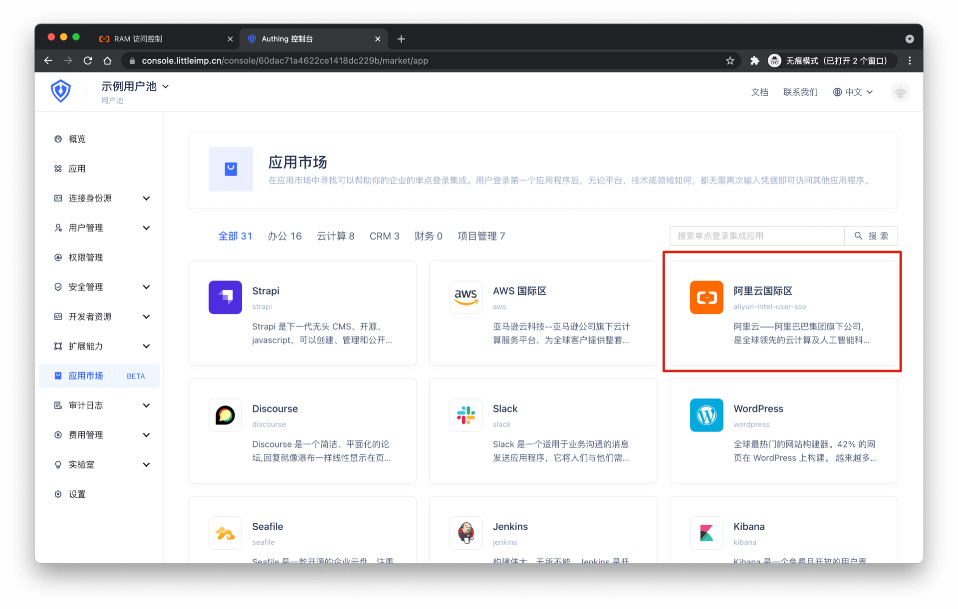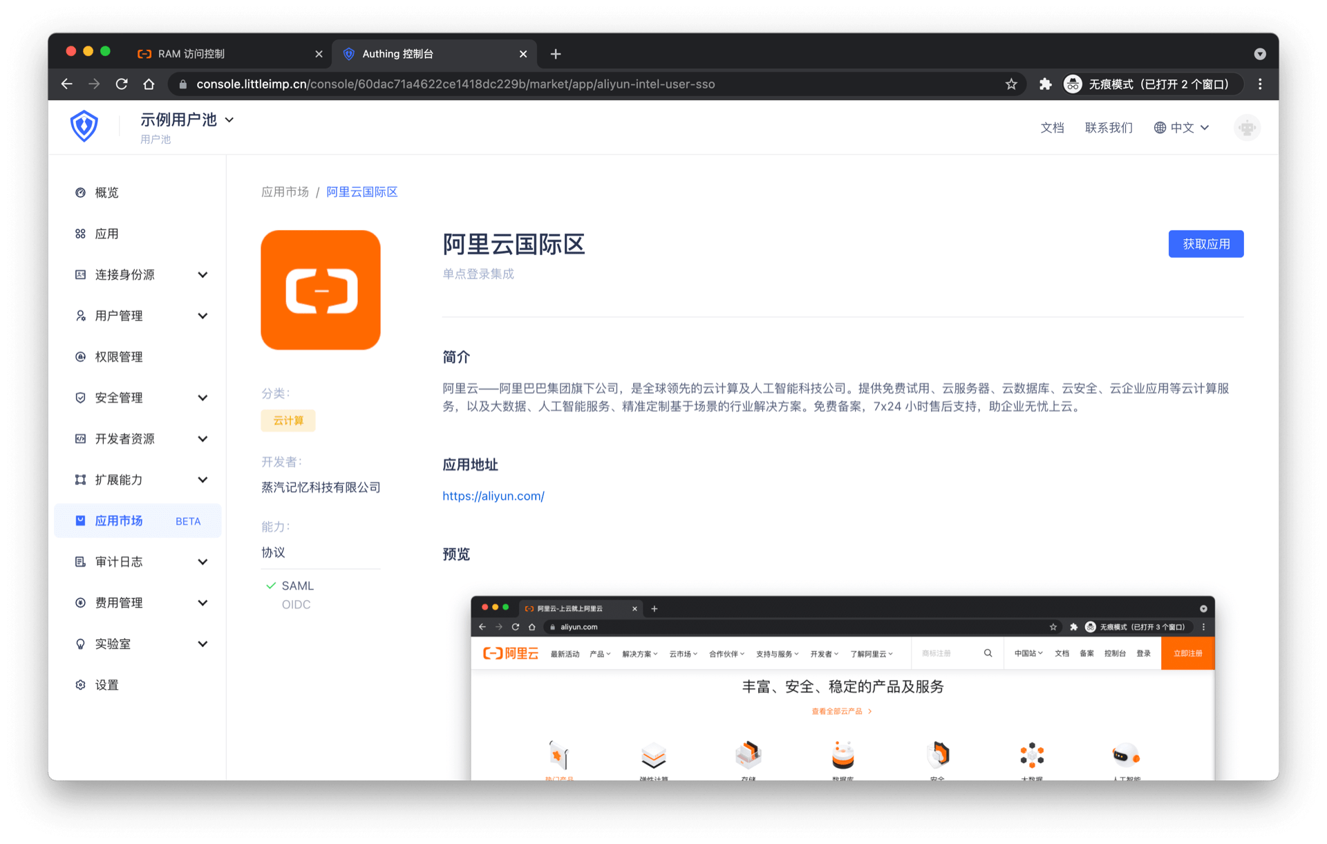 从 Authing 应用市场中获取并创建应用