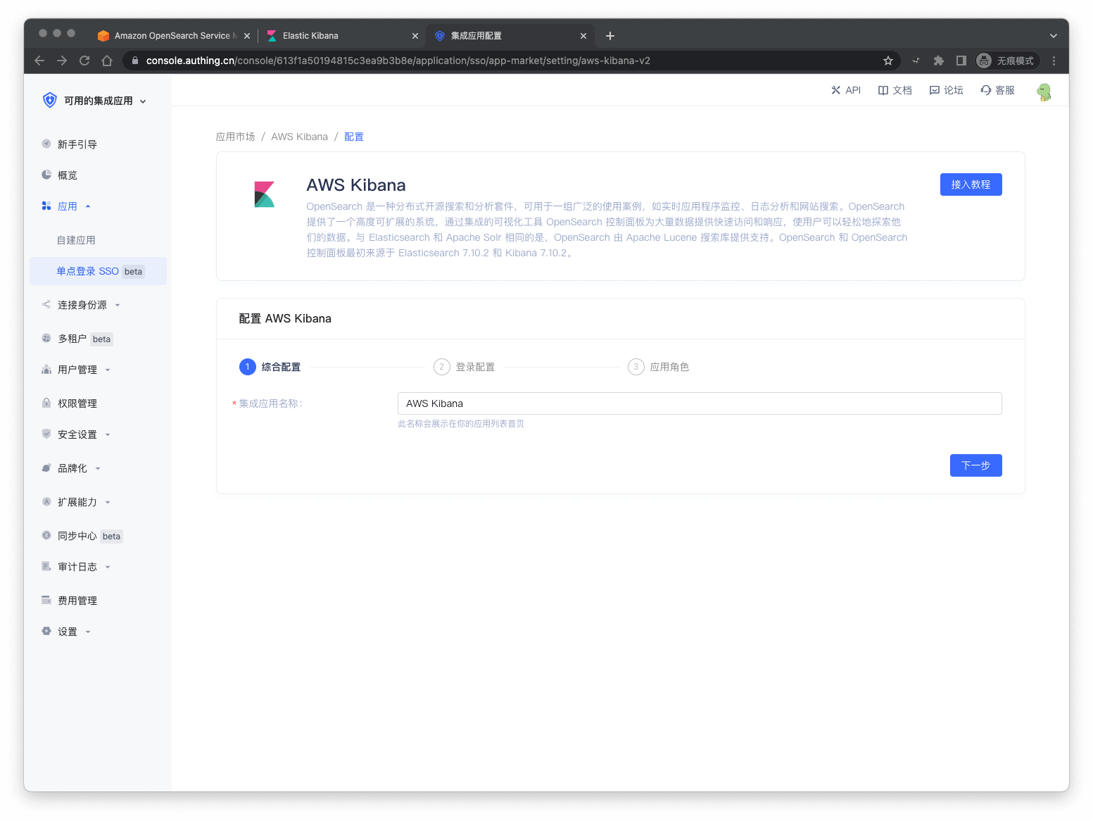 进入控制台 (opens new window) > 单点登录 SSO > 添加应用 ,点击 AWS Kibana,点击获取应用。