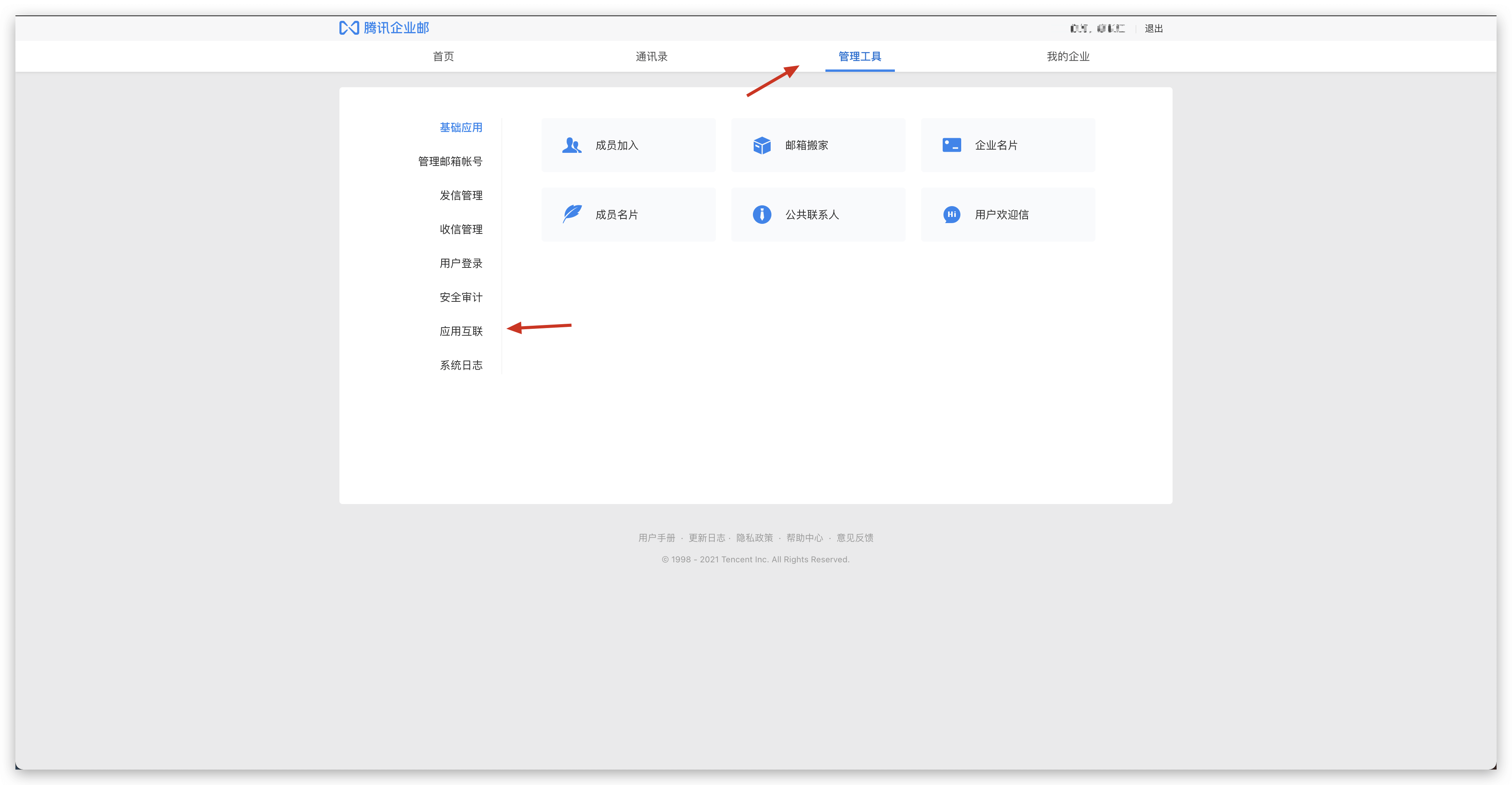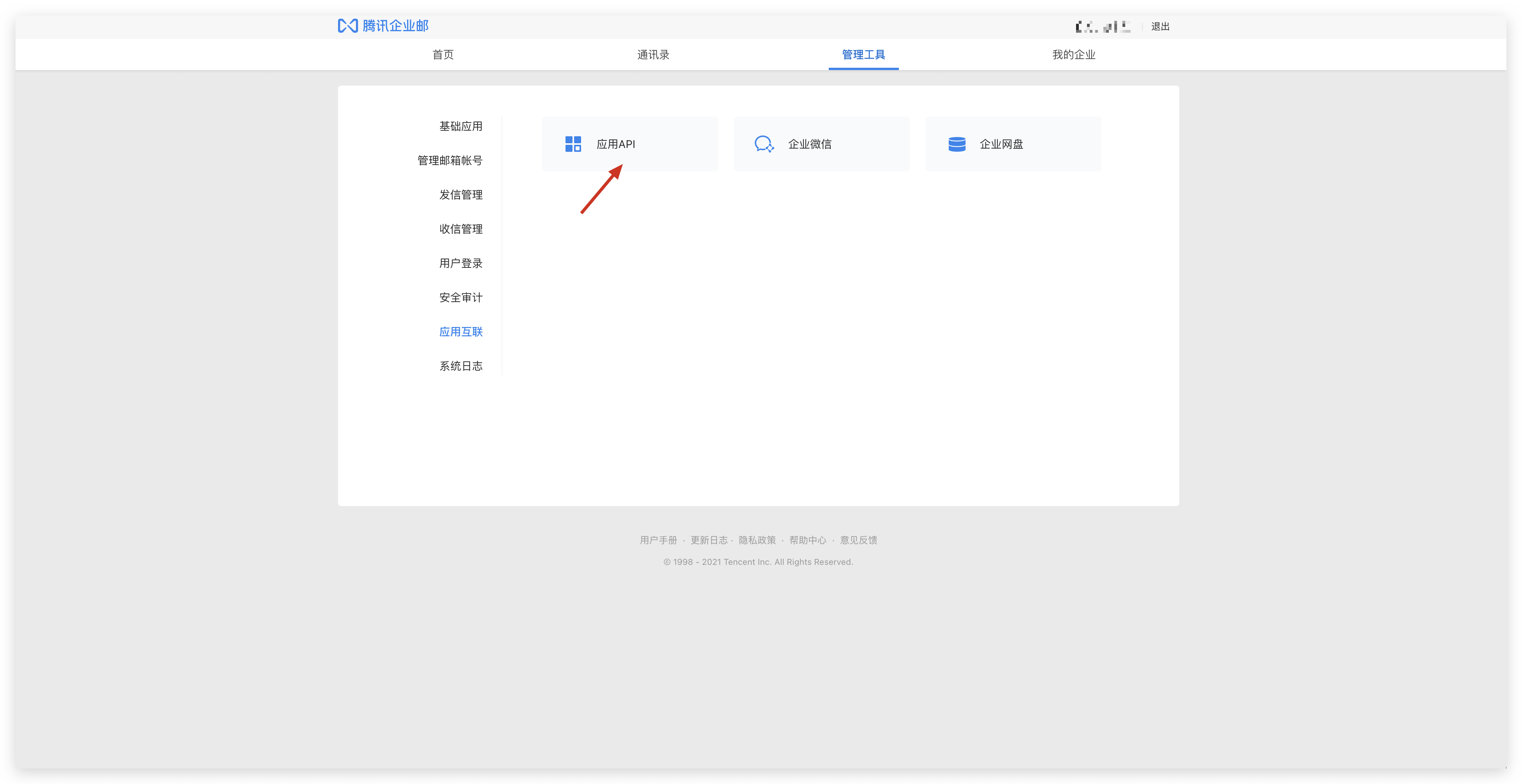 以管理员身份登录腾讯企业邮箱,点击 管理工具 -> 应用互联