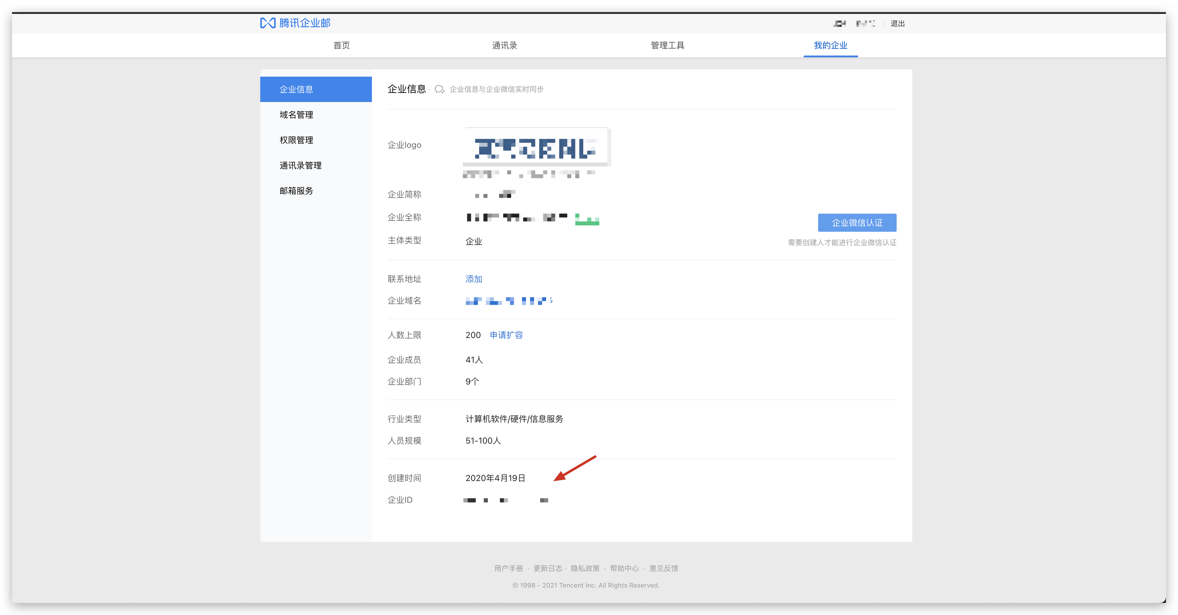 在 我的企业 -> 企业信息 中复制企业 ID