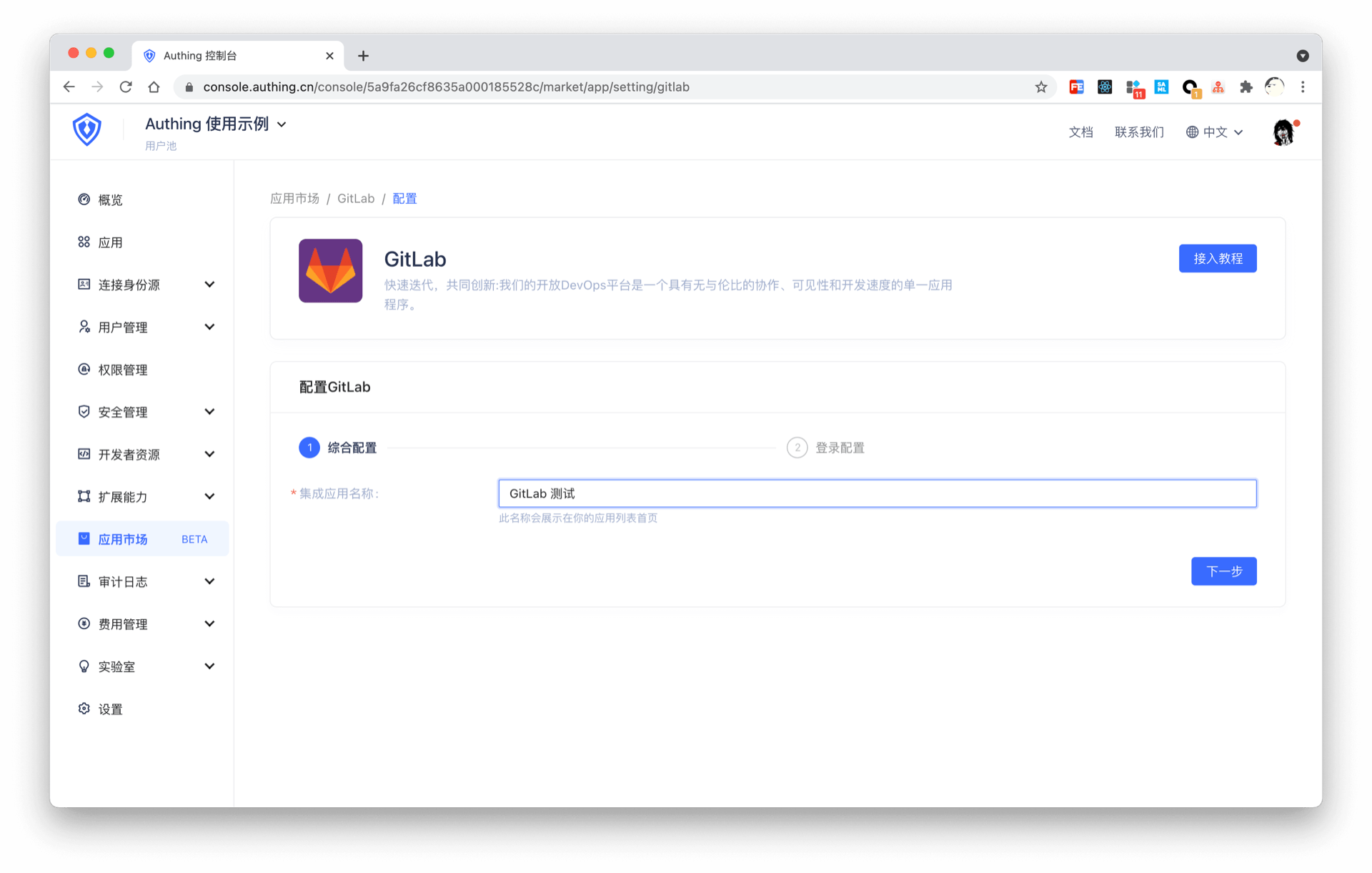 进入控制台 (opens new window) > 单点登录 SSO > 添加应用 ,找到GitLab,点击进入详情,然后点击获取应用。