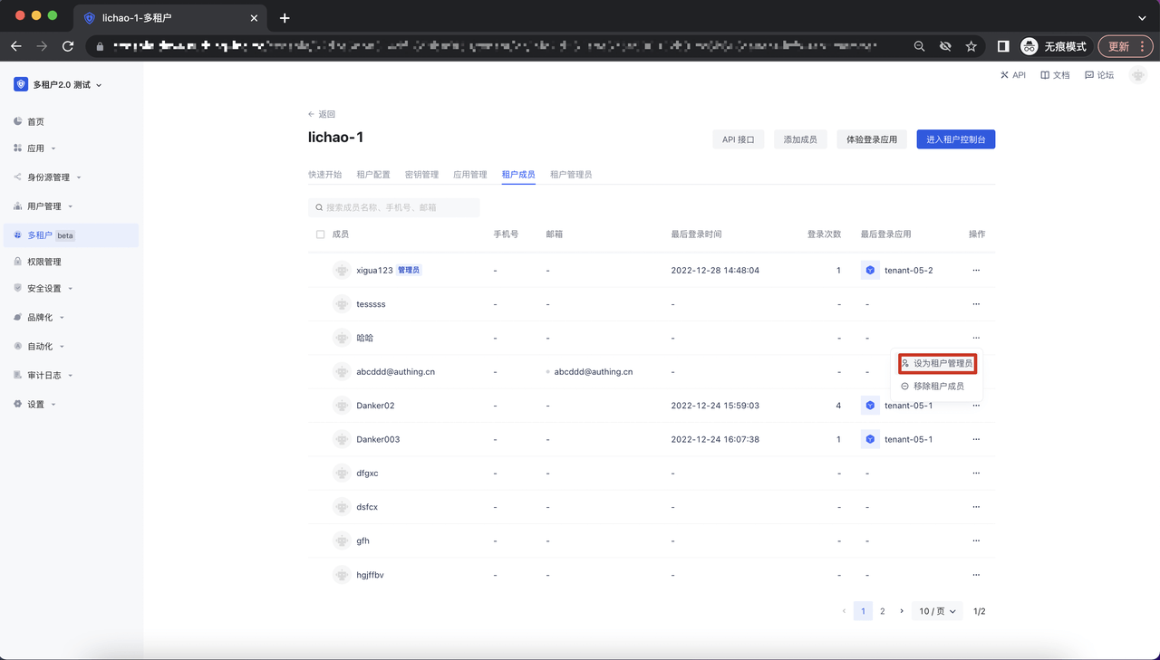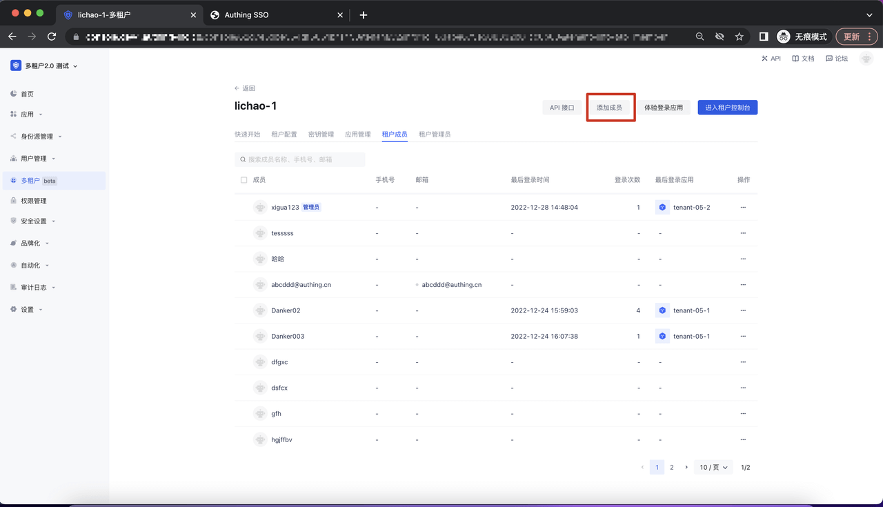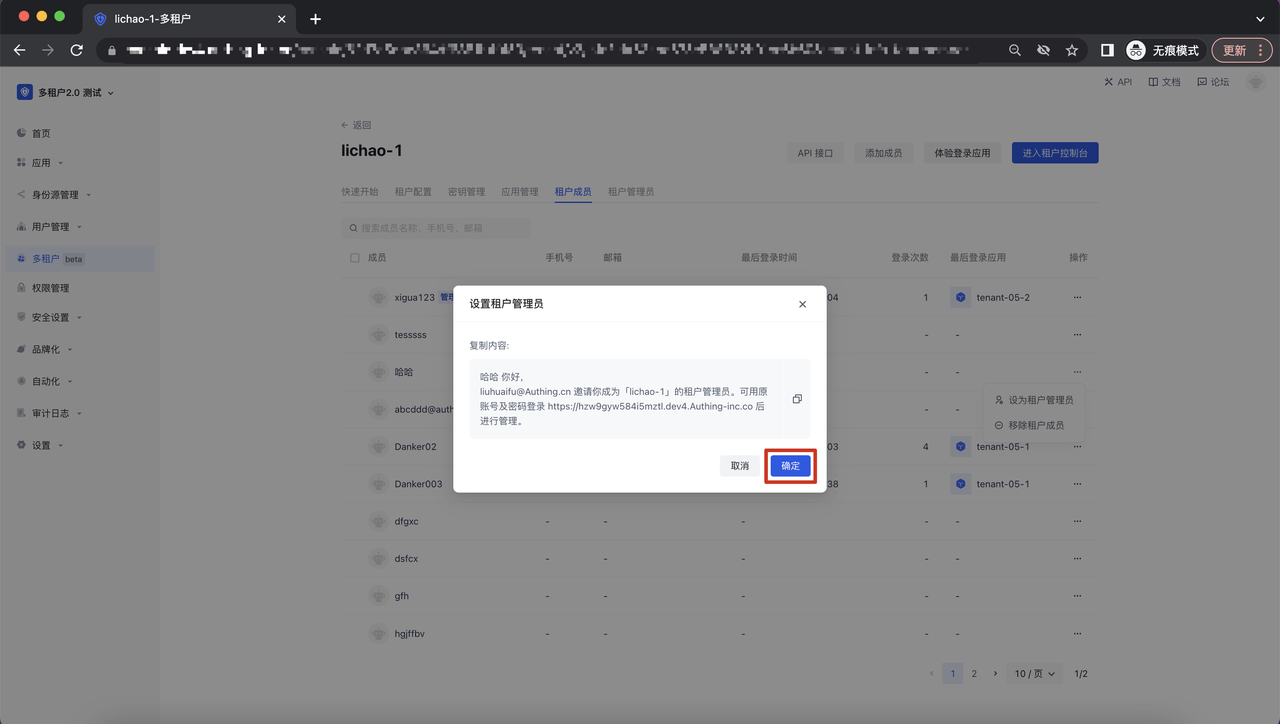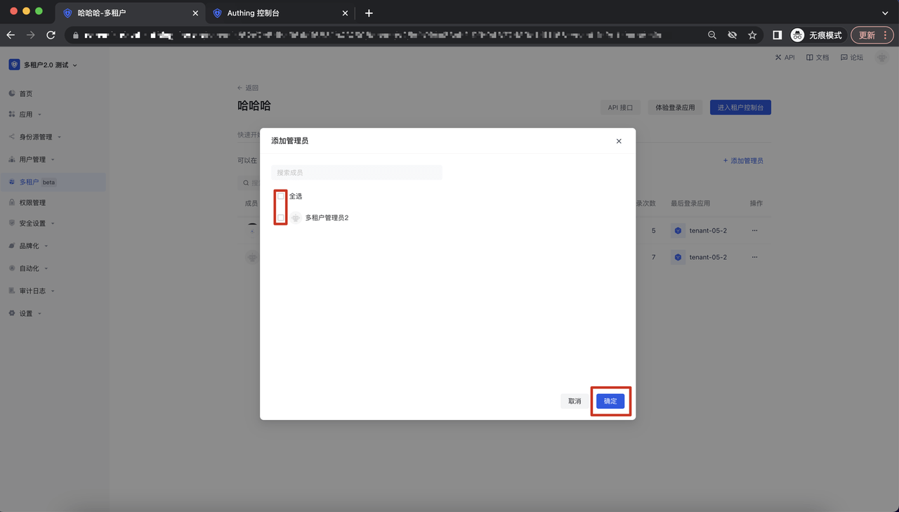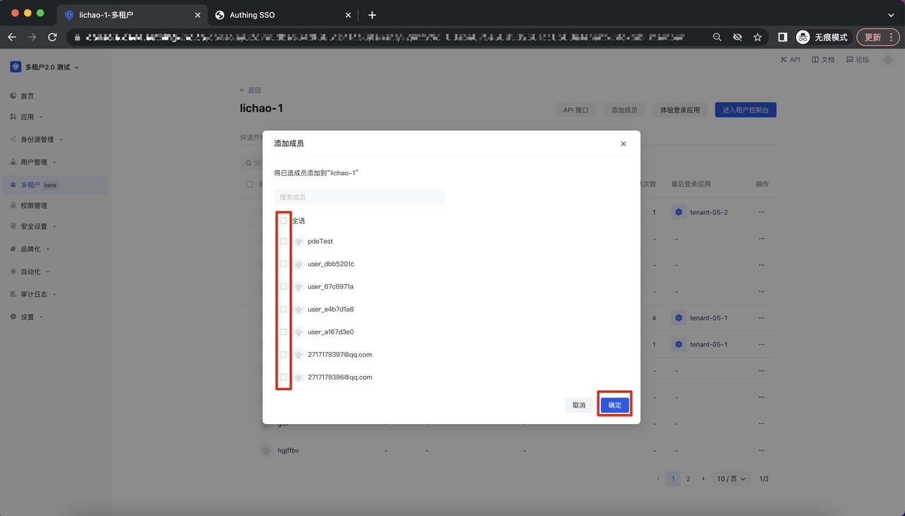 勾选相关的用户,点击「确认」,该用户将添加为该租户成员;