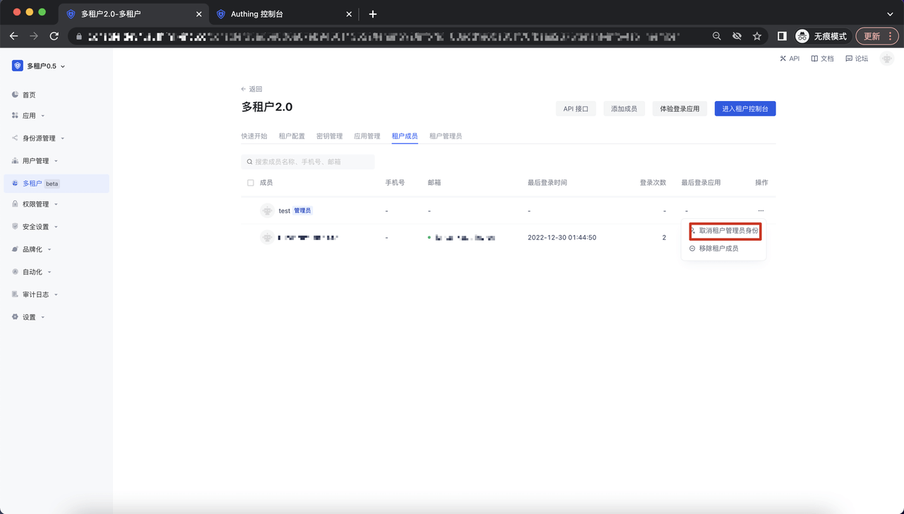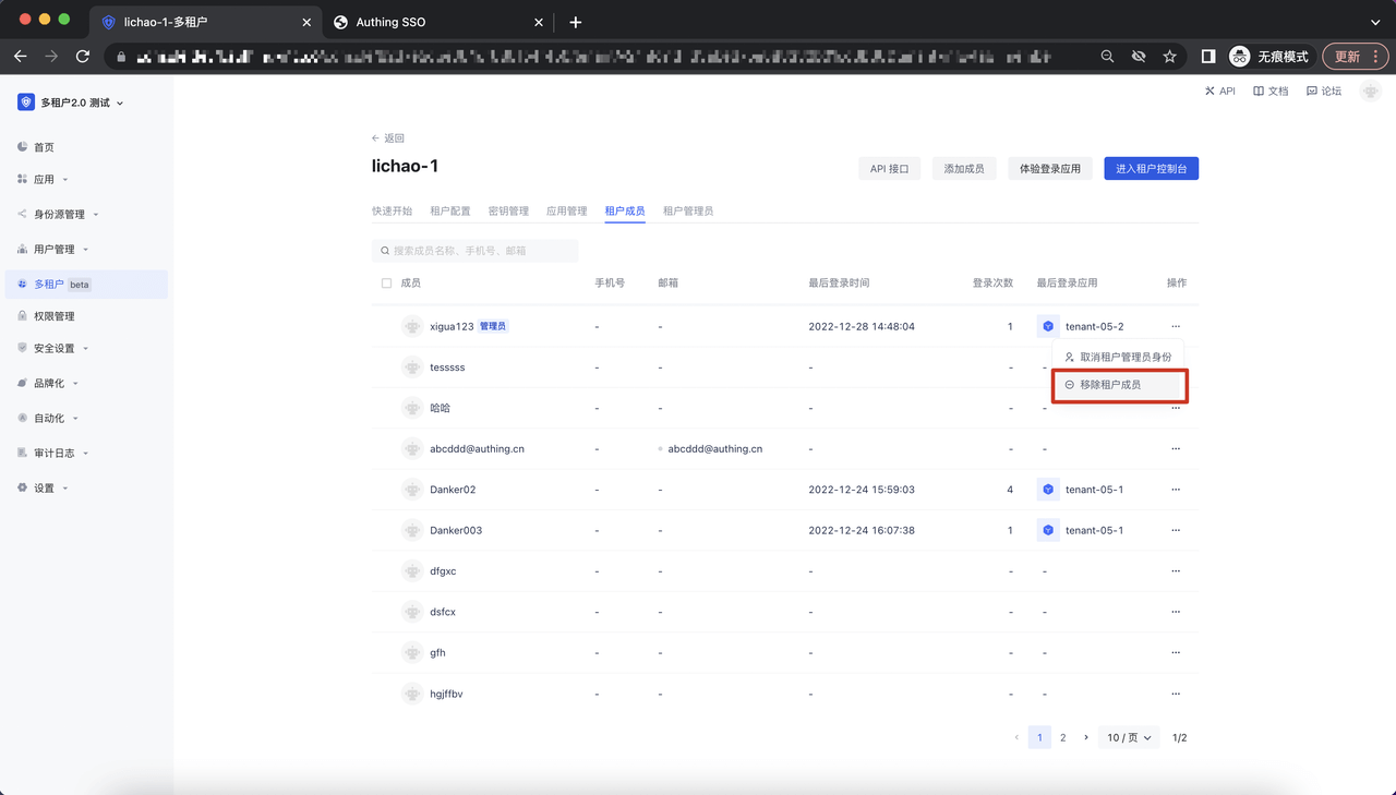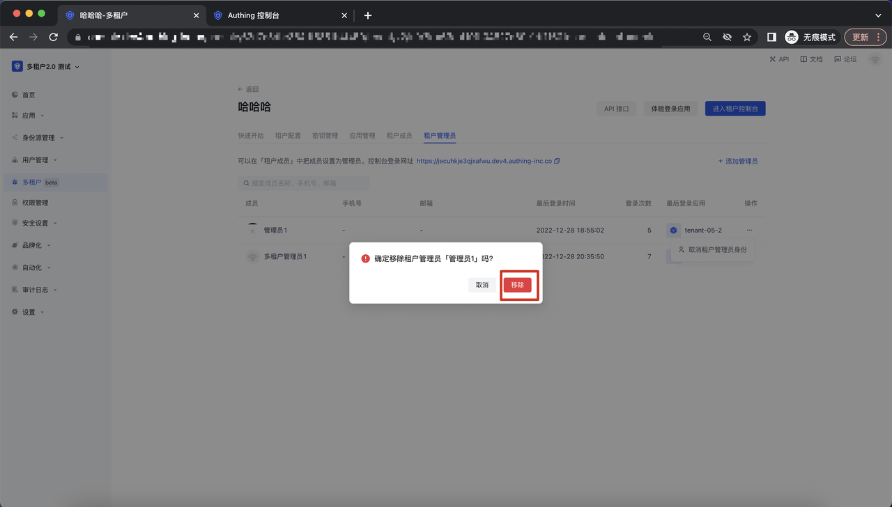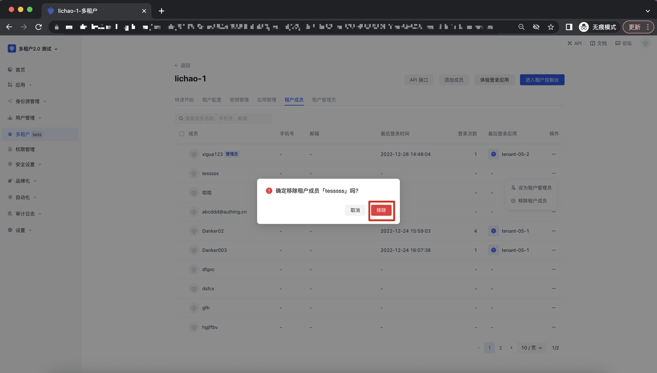 点击「移除」button,移除成功后,该用户将从该租户成员中移除;