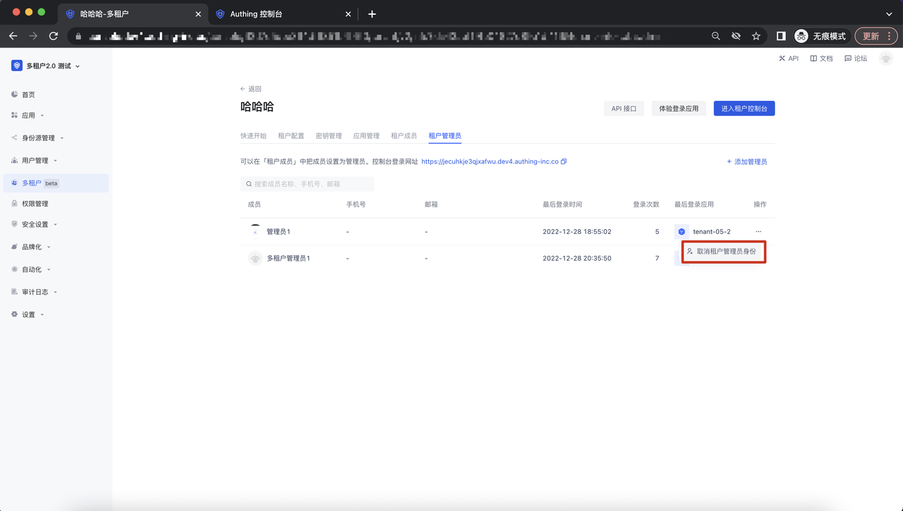 在租户详情页-租户管理员 Tab,点击操作及「取消租户管理员身份」button,调起移除二次确认弹窗: