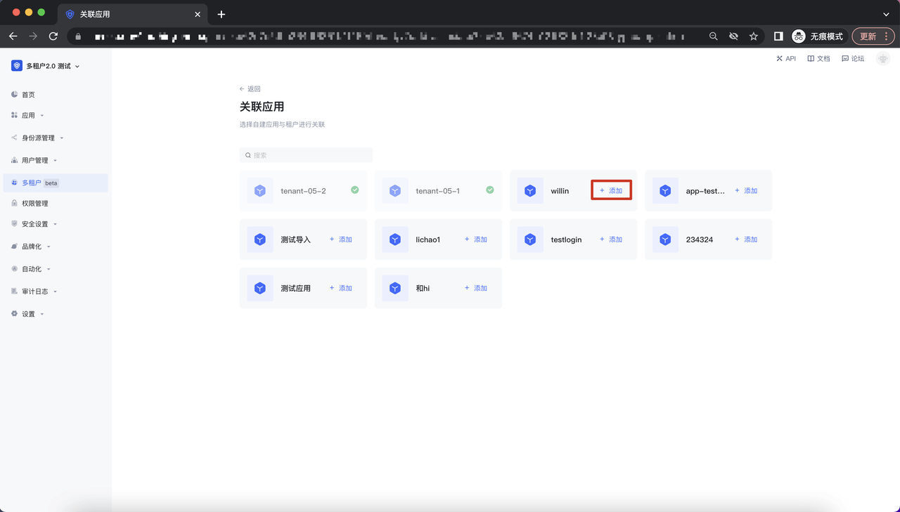 点击「添加」即可将该应用与租户进行关联;