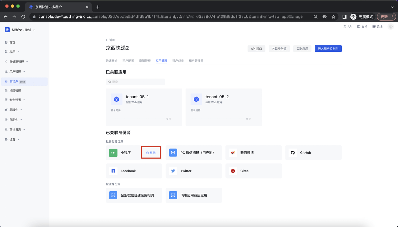 点击应用卡片上的「移除」按钮,调起二次确认弹窗,即可取消该应用与租户的绑定关系: