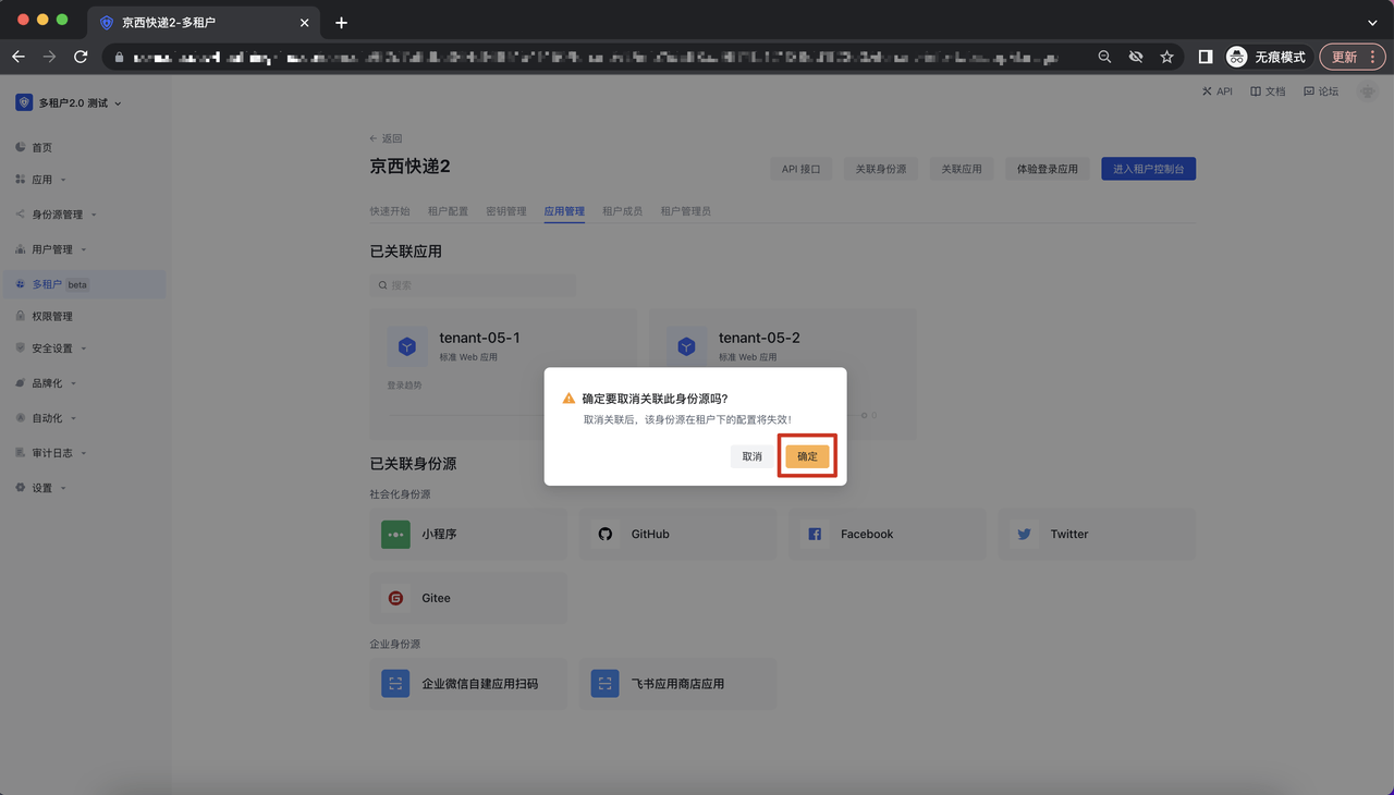 点击身份源卡片上的「移除」按钮,调起二次确认弹窗,即可取消该身份源与租户的绑定关系: