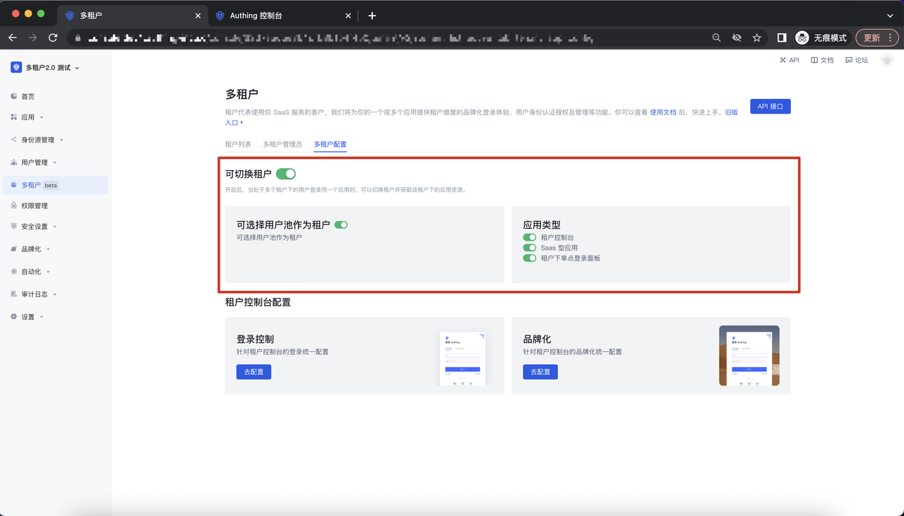 该功能为是否可切换租户的开关,当一个用户在多个租户下,通过配置租户控制台、 Saas 型应用、租户下单点登录面板是否可切换,来定义租户和租户之间的隔离性;