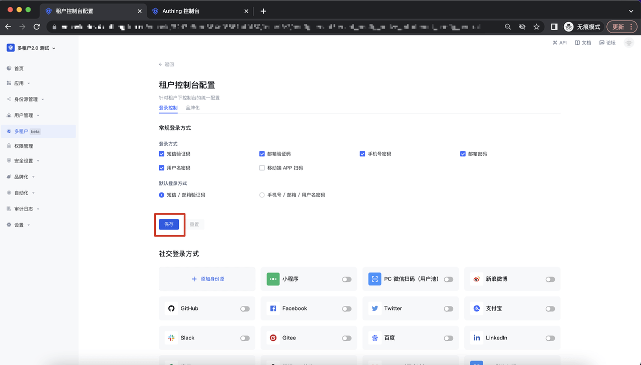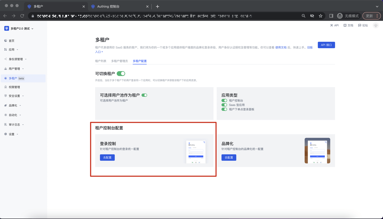 进入多租户配置 Tab,点击登录控制-去配置,进入到租户控制台配置-登录控制详情页面:
