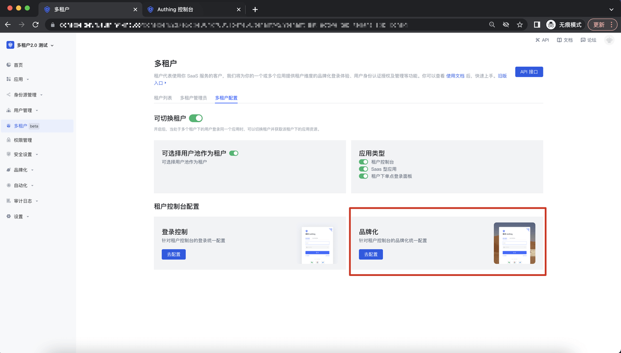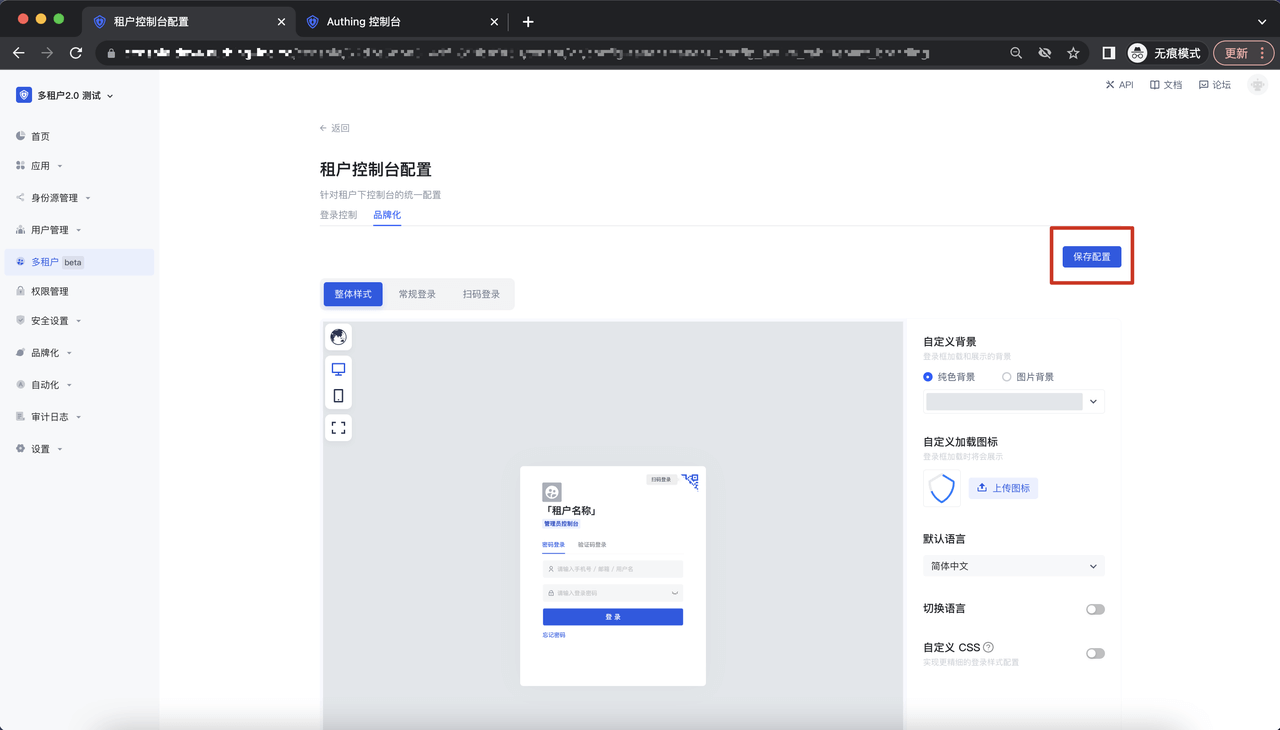 进入多租户配置 Tab,点击登录控制-品牌化,进入到租户控制台配置-品牌户详情页面: