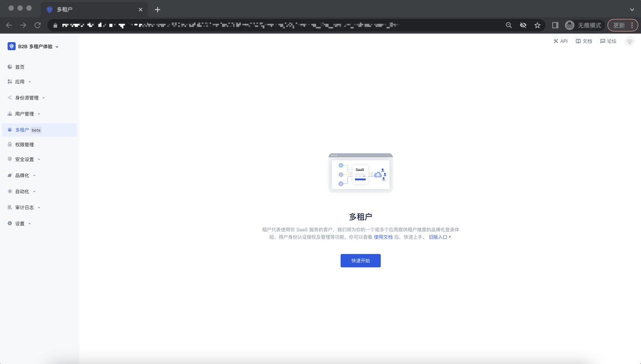 首先进入 Authing 控制台, 在控制台菜单栏点击 「多租户」模块,进入到多租户默认页面,点击「快速开始」button;