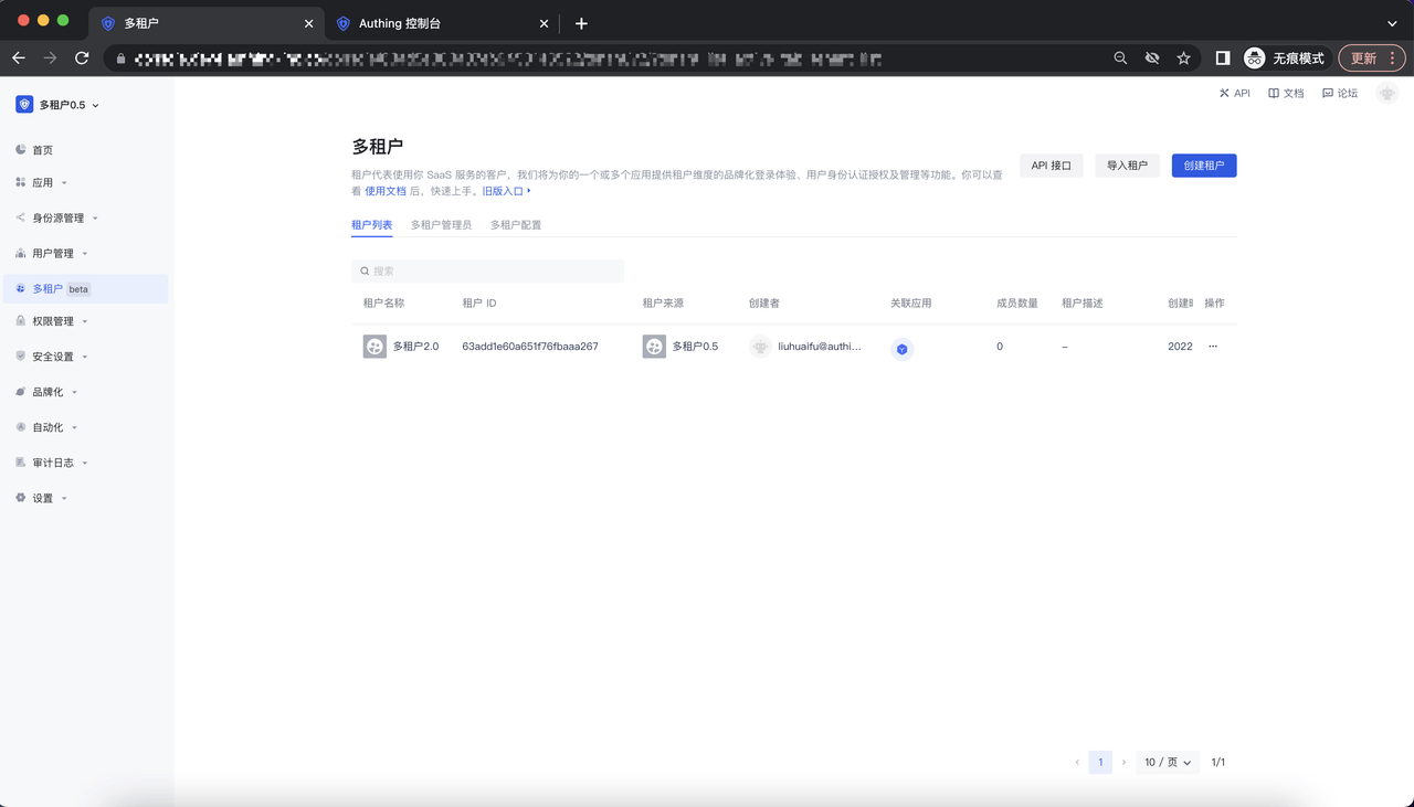 点击「开始多租户之旅」button,进入多租户 list 页面: