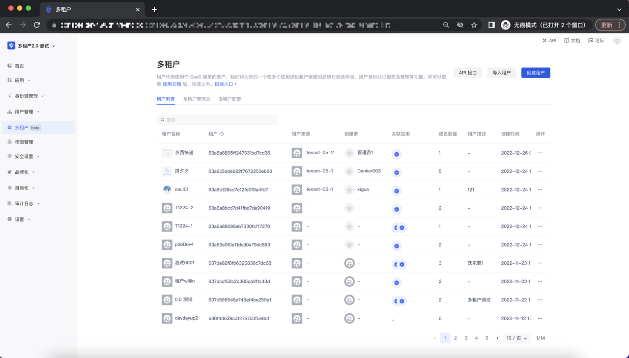 租户列表旨在帮助客户管理相关的租户,通过获取租户的头像、名称、ID 及租户的其它情况,帮助多租户超级管理员及多租户管理员更快捷的管理租户;