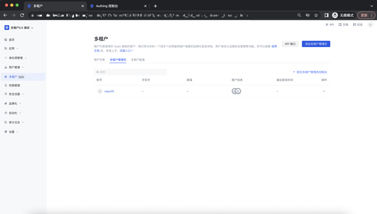 该列表展示了所有的多租户管理员,我们目前支持将用户池内的用户设置为多租户管理员,多租户管理员拥有一个或多个租户的全部读、写权限;