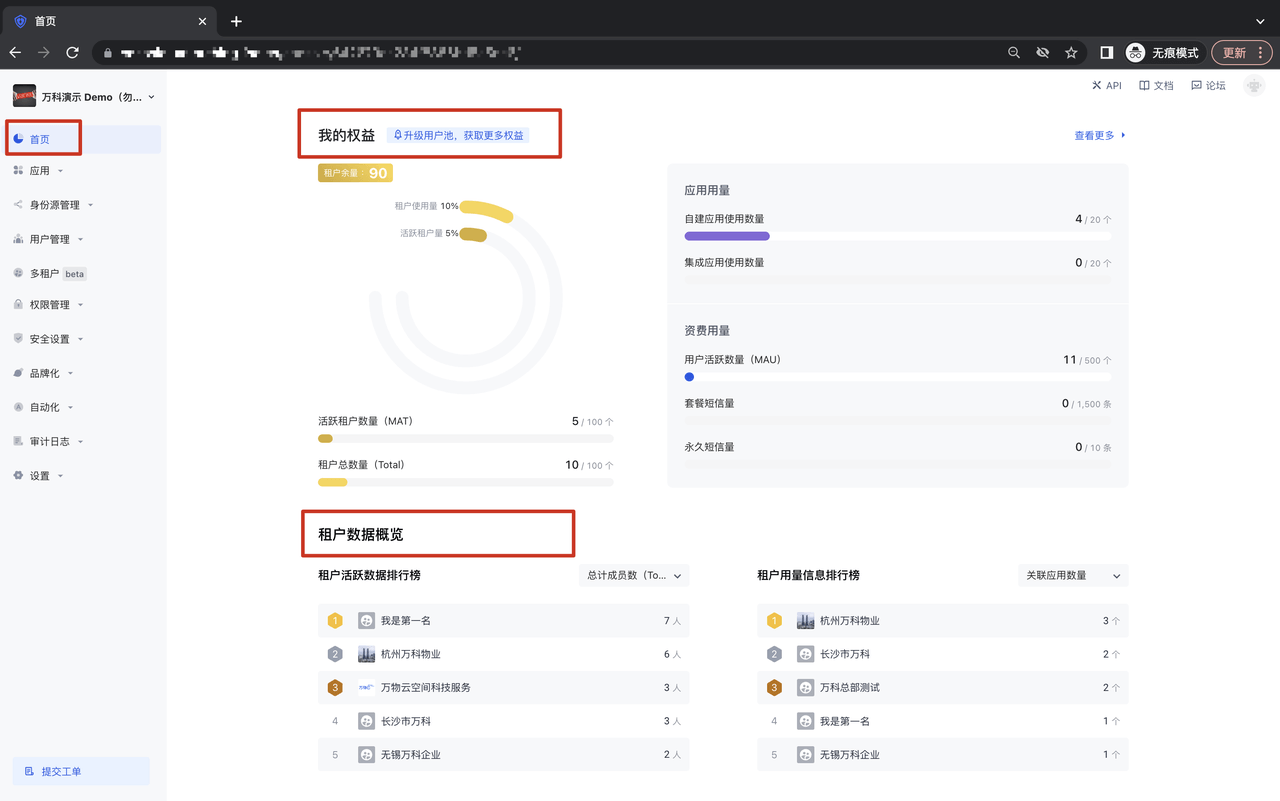 在 Authing 2B 用户池场景下,我们提供了租户管理视角的数据概览,在这里,你可以看到所有租户的应用和用户活跃数据;与此同时,也可以看到租户的用量信息使用情况,方便更好的监控及管理租户;