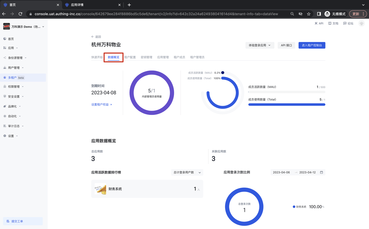 在某个租户详情页面,点击数据概览,可以看到专属于这个租户的使用数据详情: