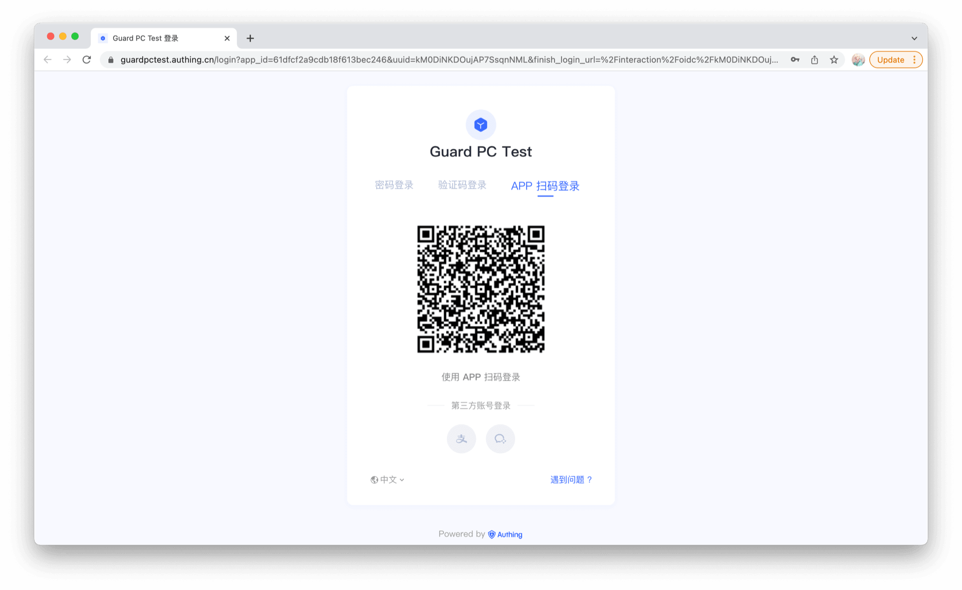 当 Web 应用需要登录时,登录界面会显示一个可供 App 扫码的二维码,如下图: