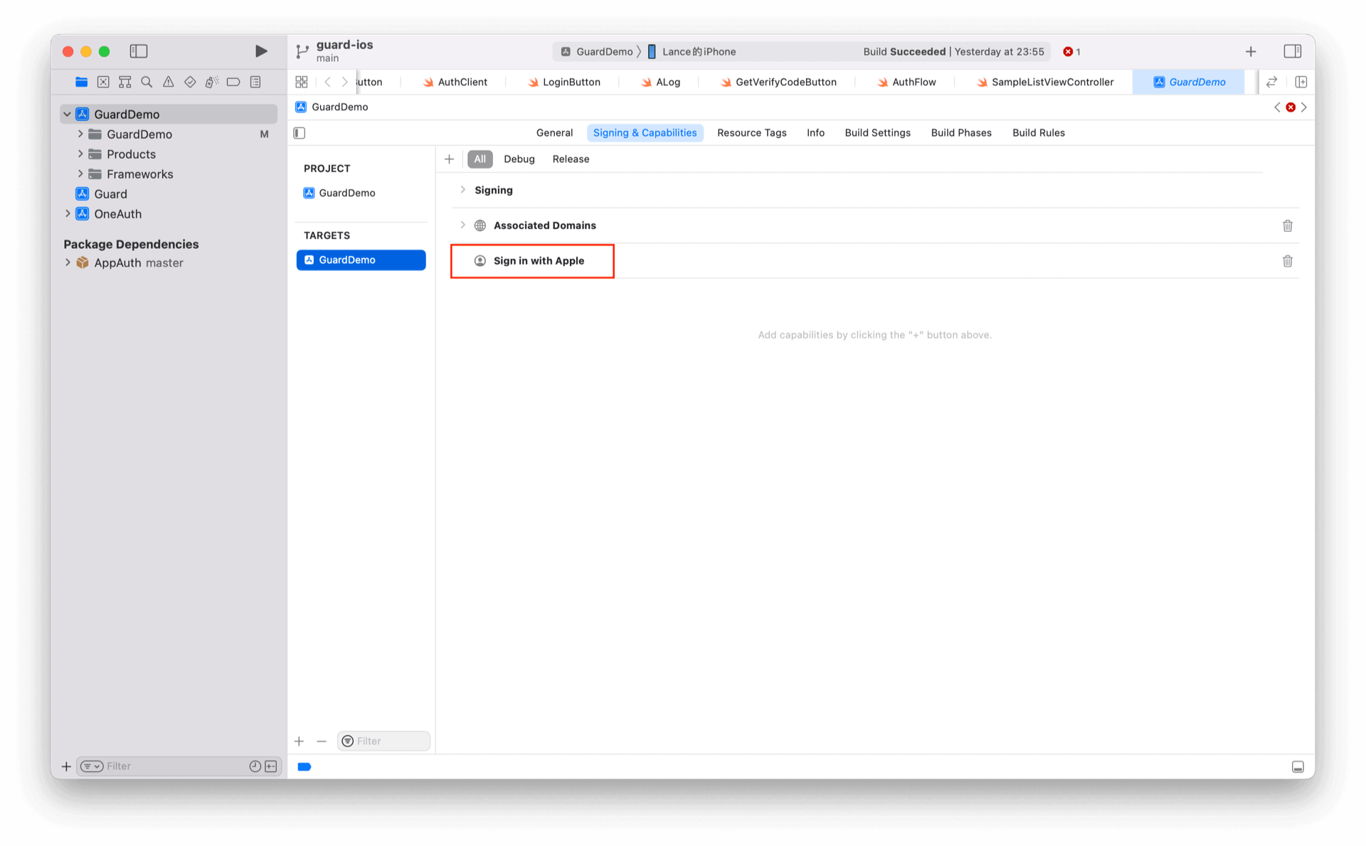 ¶ 第三步:在工程里面启动 Sign in with Apple