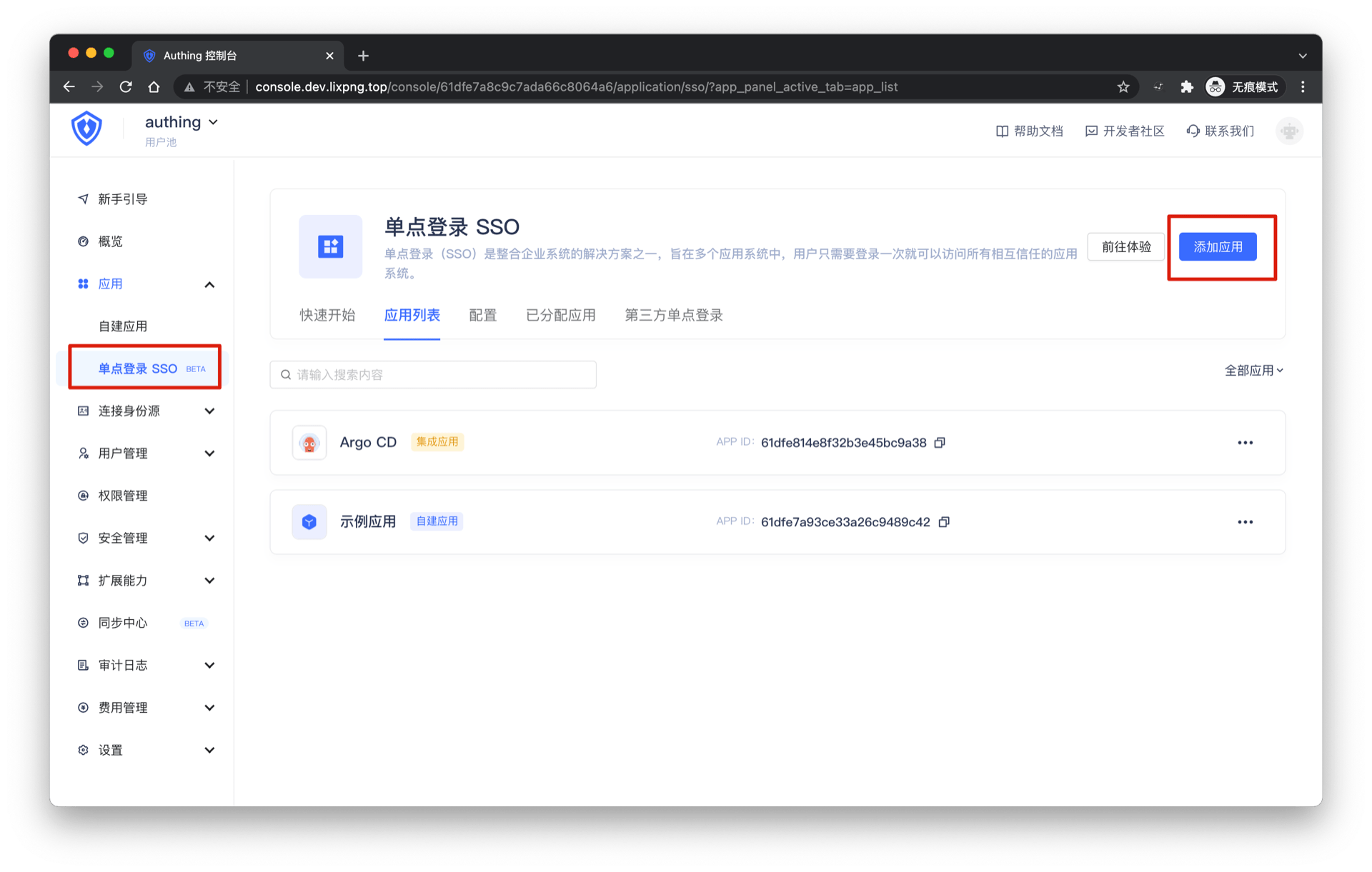 在 Authing 控制 应用 -> 单点登录 SSO 页面点击「添加应用」