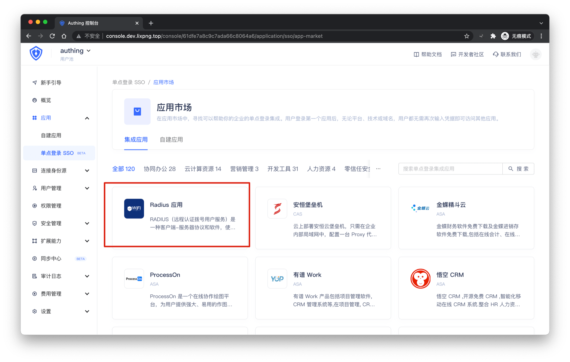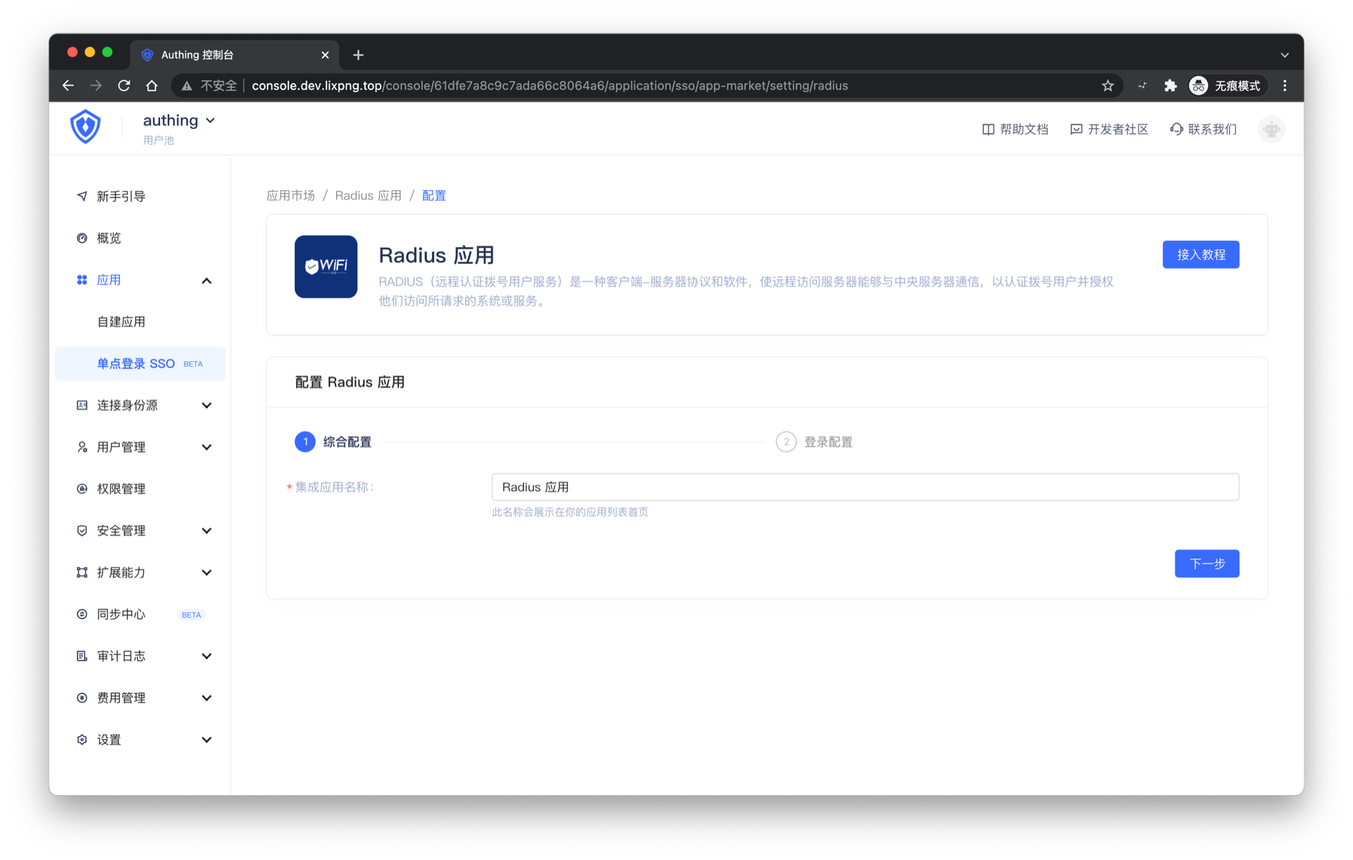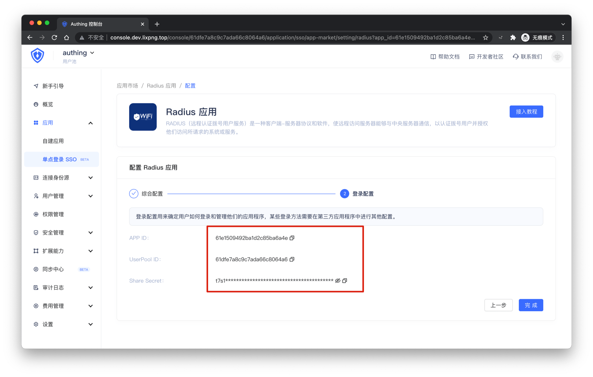 ¶ 第三步:在 Authing 控制台创建 Radius 应用