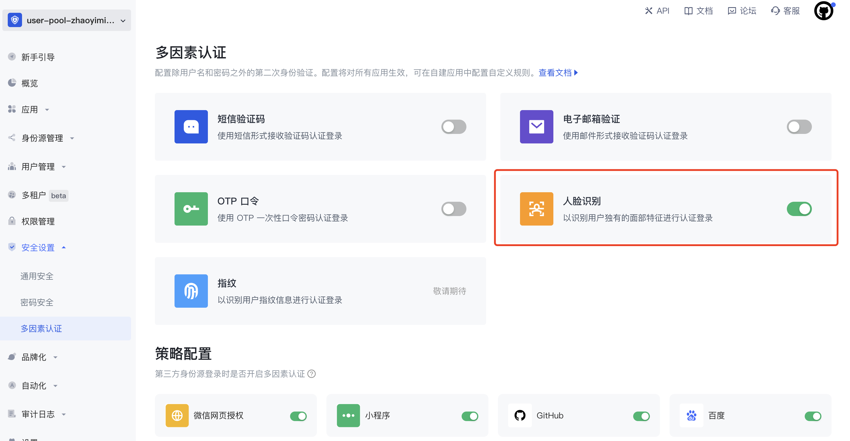 进入 Authing 控制台,左侧菜单选择 安全设置 -> 多因素认证,右侧开启人脸识别