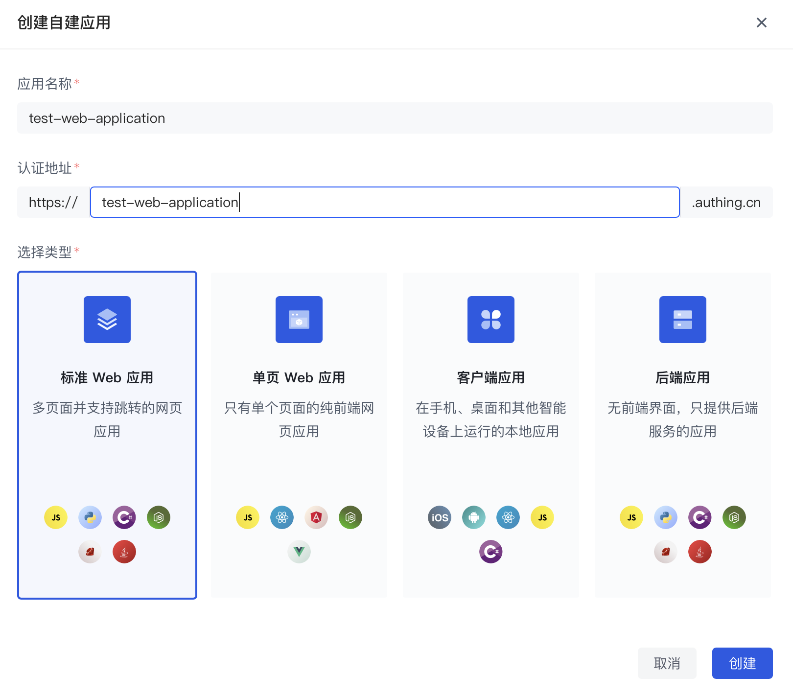 - 填写应用名称和认证地址、选择标准 Web 应用