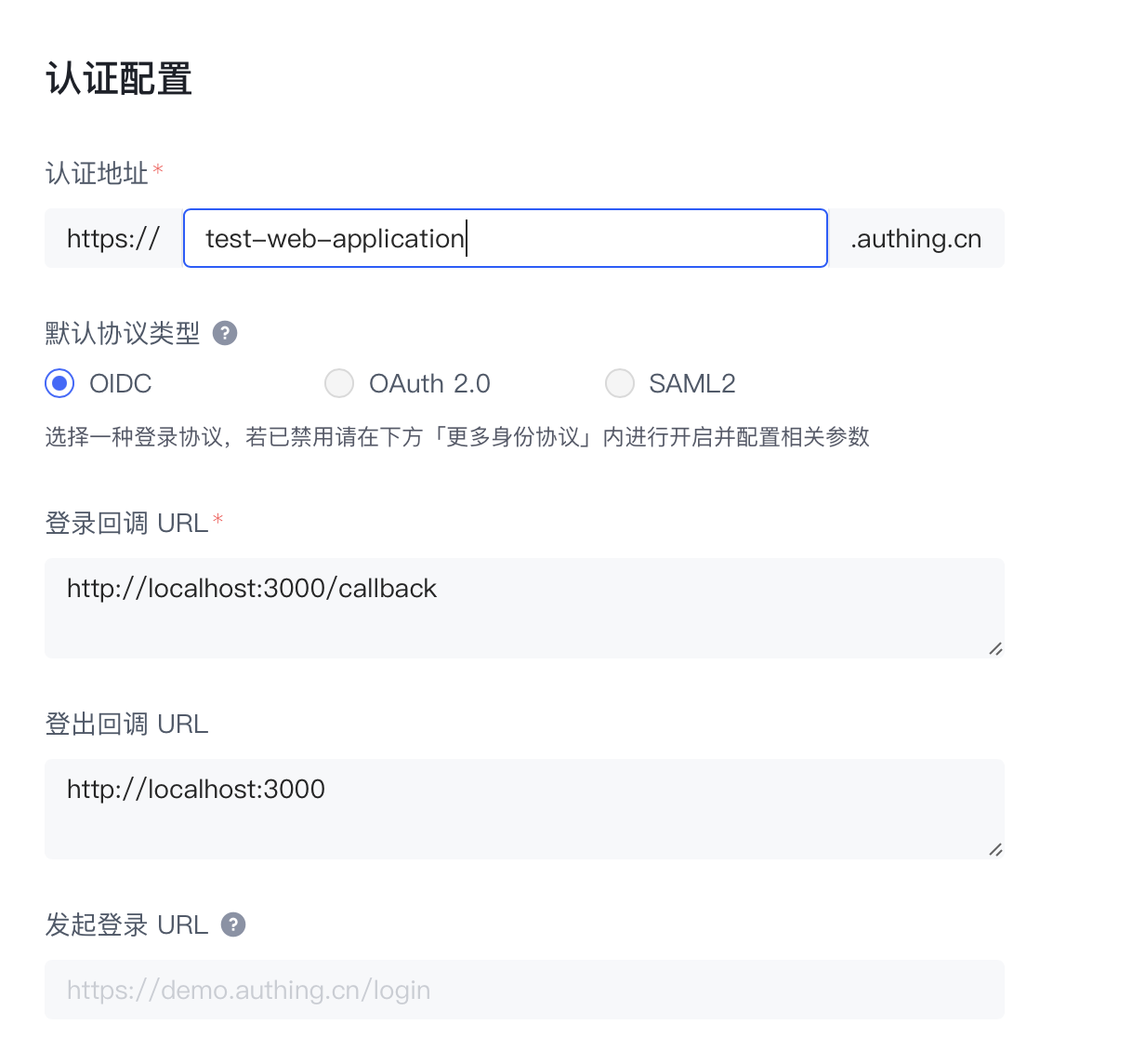 - 在认证配置处填写登录回调 URL和登出回调 URL