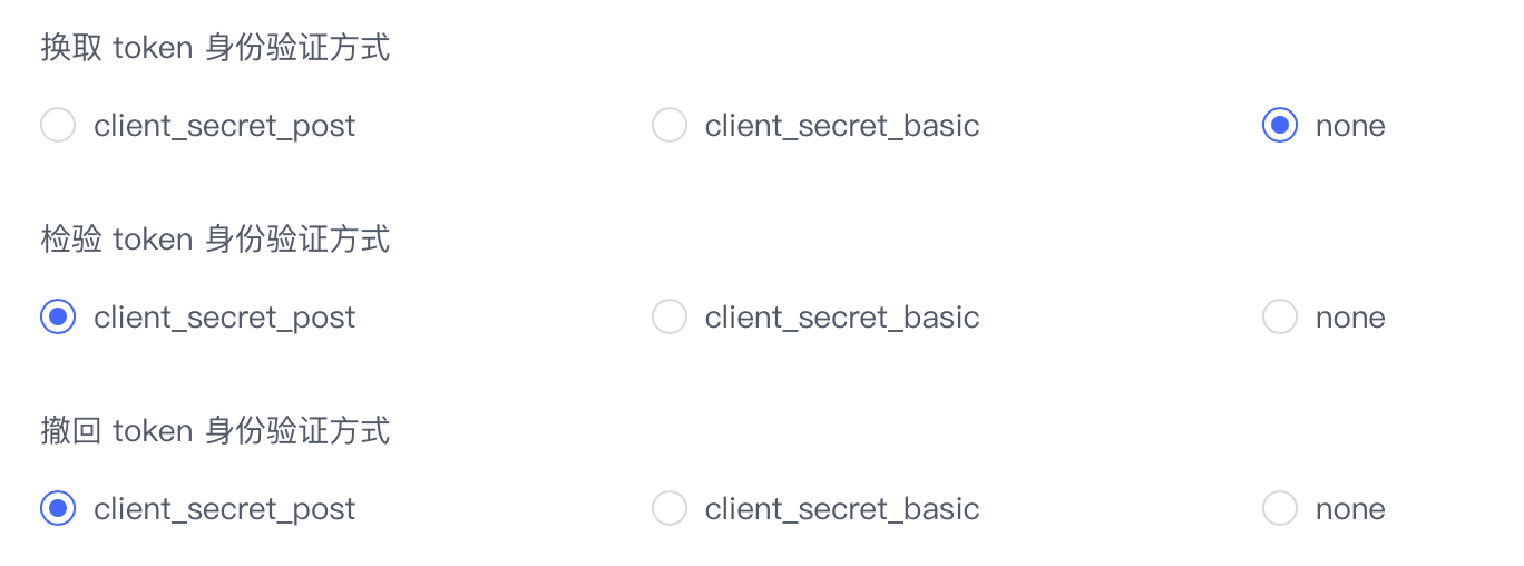 | revocationEndPointAuthMethod | client_secret_post / client_secret_basic / none | 否 | 撤回 token 端点认证方式 |
