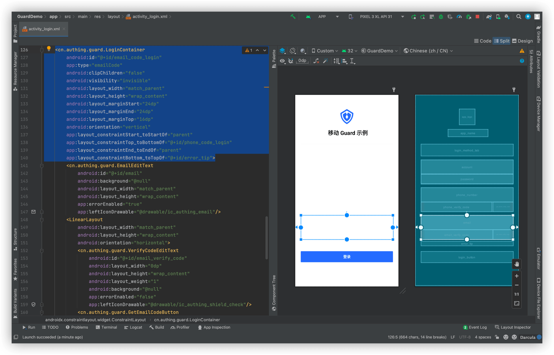 再放置一个 LoginContainer,将 EmailEditText、VerifyCodeEditText、GetEmailCodeButton 放到第三个 LoginContainer 里面,设置 type 属性,app:type="emailCode"。