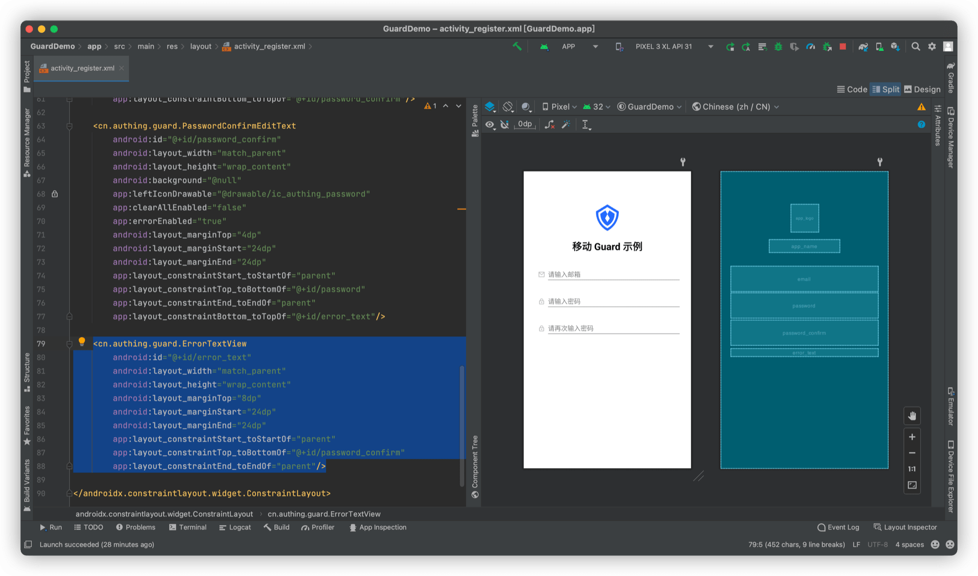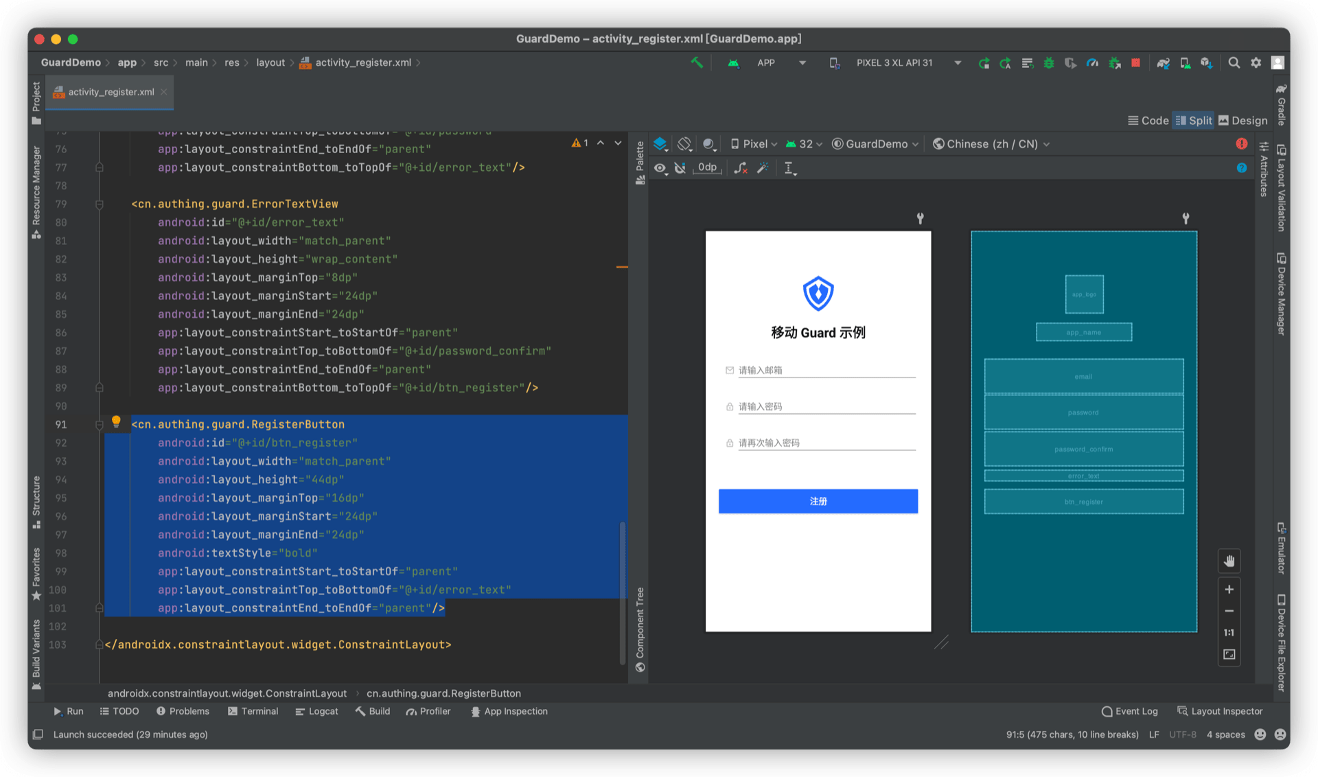 一个具有注册业务能力的界面就开发完了,输入有效的邮箱和密码,点击注册按钮就可以完成注册。如果注册出现错误,服务器返回的错误信息也能直接显示在 ErrorTextView 上。