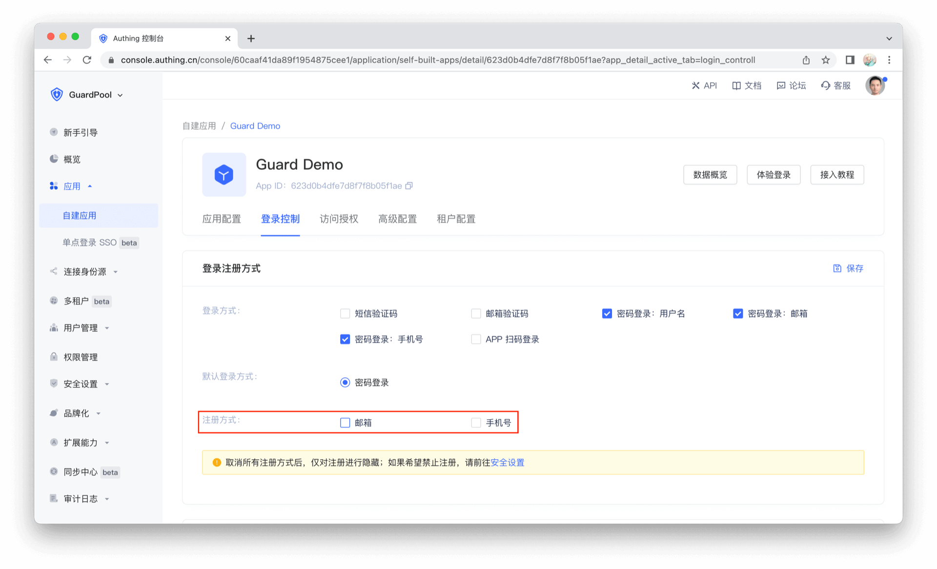 在一些场景下,需要在页面上隐藏注册按钮。我们在控制台做如下修改: