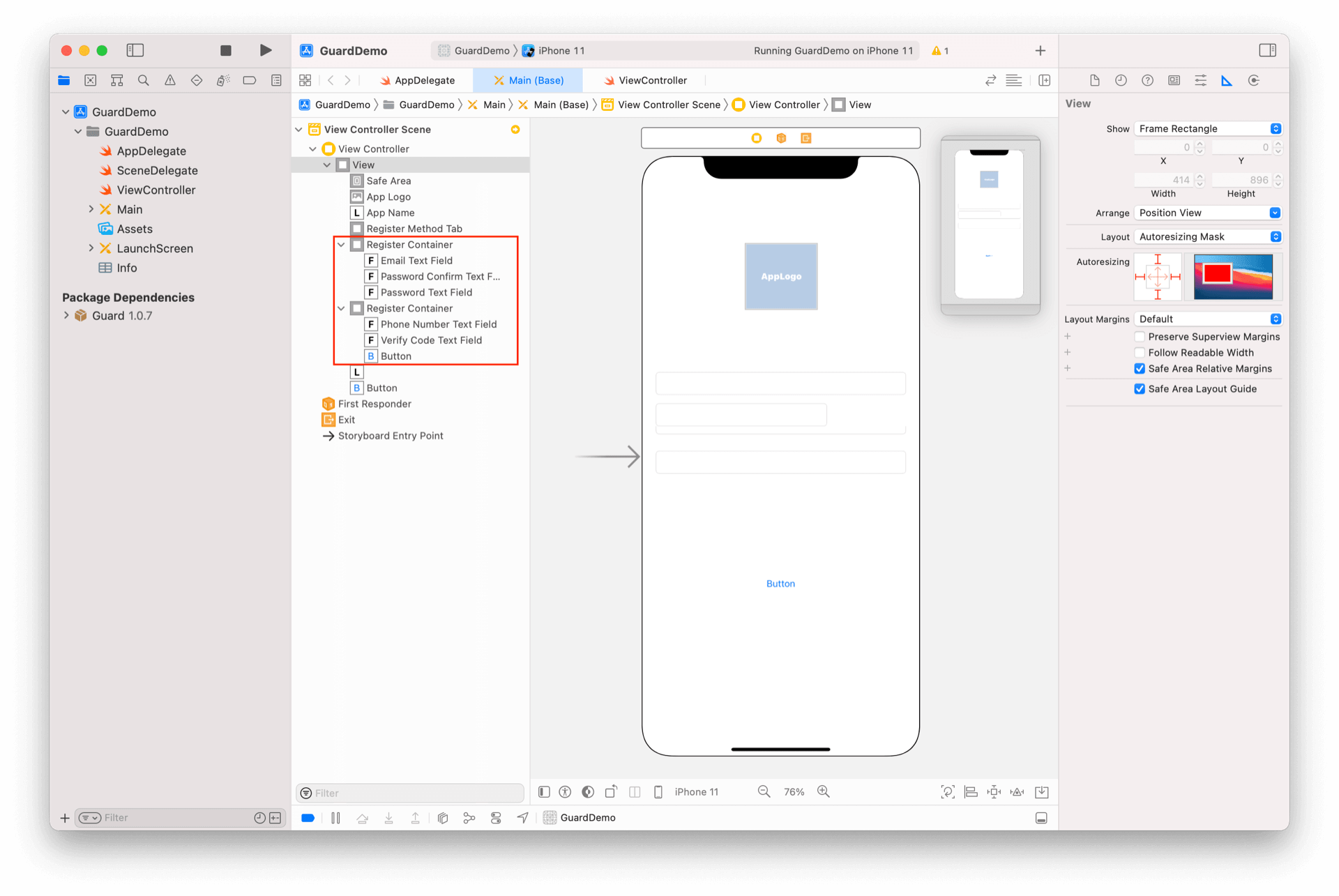 小技巧: 在 IB 里面放置重叠的控件时,xcode 会修改层级关系。我们可以先把两个 RegisterContainer 放置在不同的区域,调整好大小以及内部控件位置后,将其中一个拖放至目标位置,再通过手动修改第二控件的 Y 坐标来实现重叠效果。