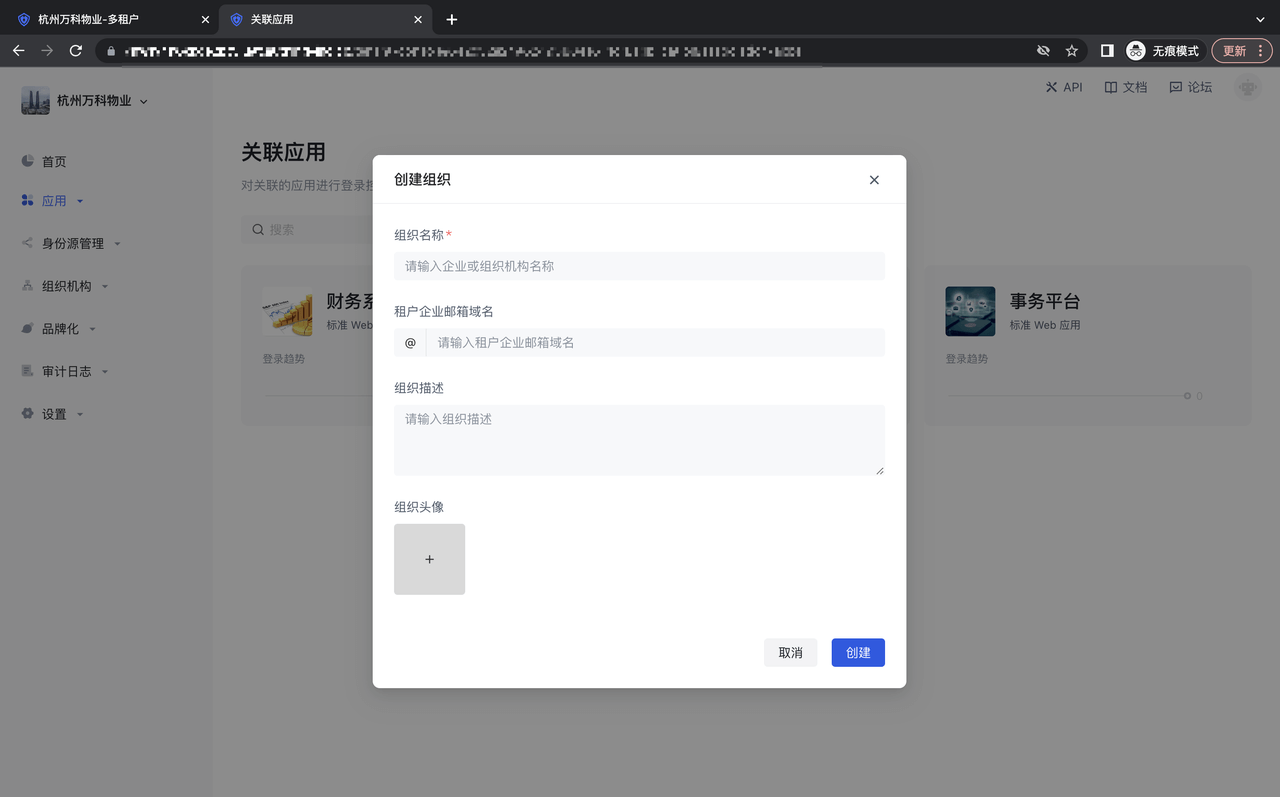 点击左上角的「创建租户」button,调起加入租户的弹窗,输入相关的组织名称、企业邮箱域名、组织描述、组织头像,点击「创建」button,即可跳转到相应的租户控制台: