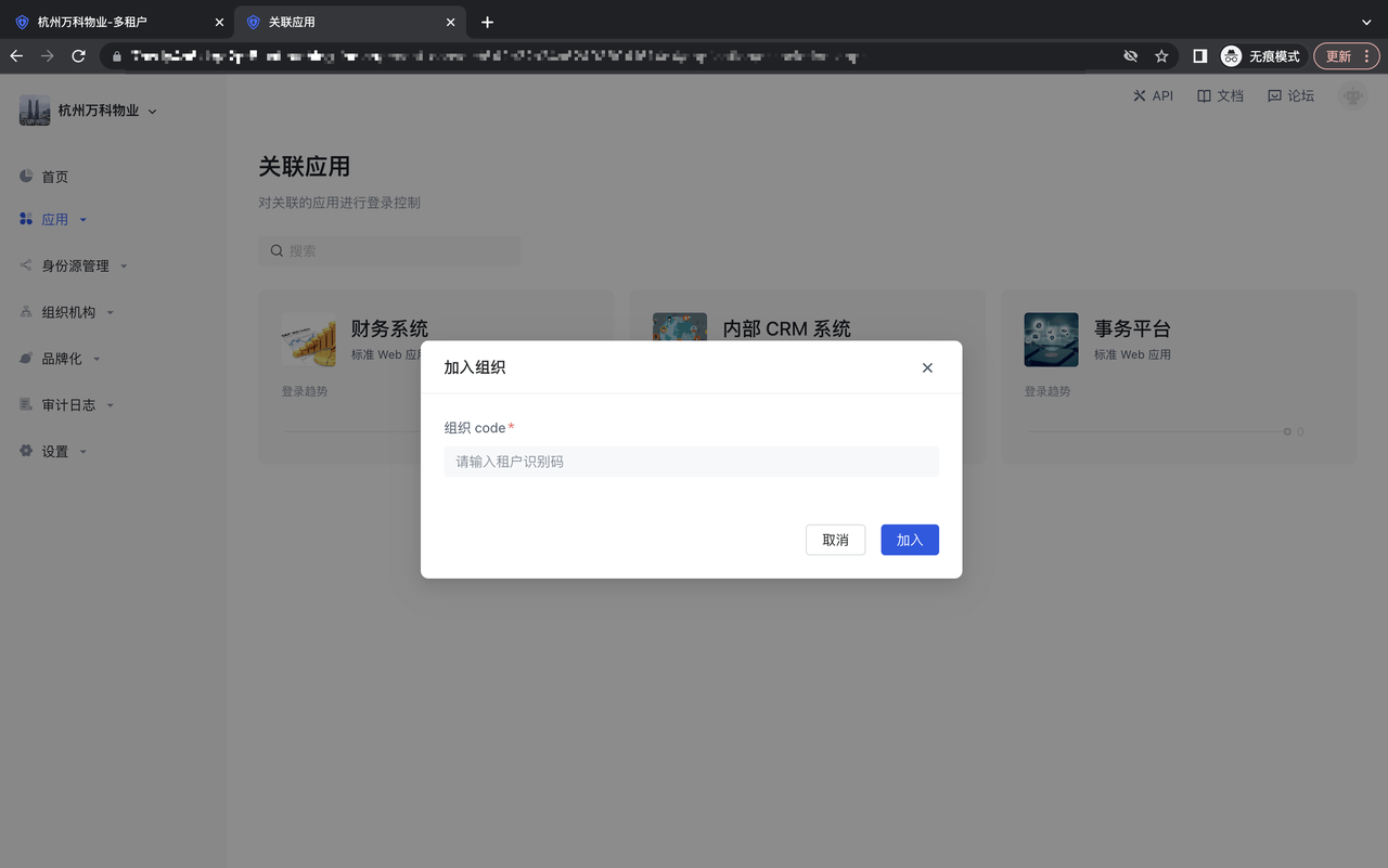 点击左上角的「加入租户」button,调起加入租户的弹窗,输入租户的识别码及进行相关的企业邮箱域名校验,即可跳转到相应的租户控制台: