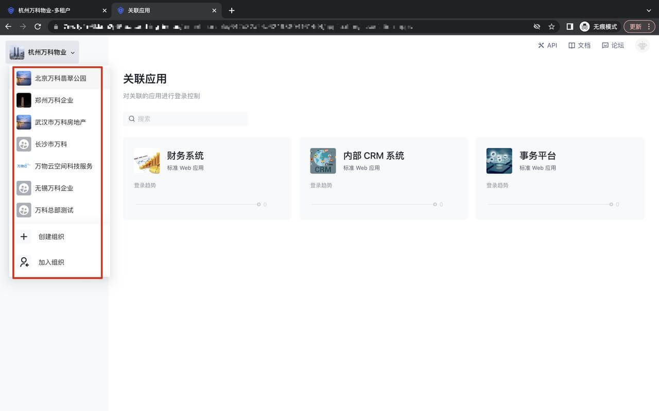 点击左上角的租户名称,会展示出所有该管理员所在的租户,通过点击租户名称,即可跳转到相应的租户控制台;