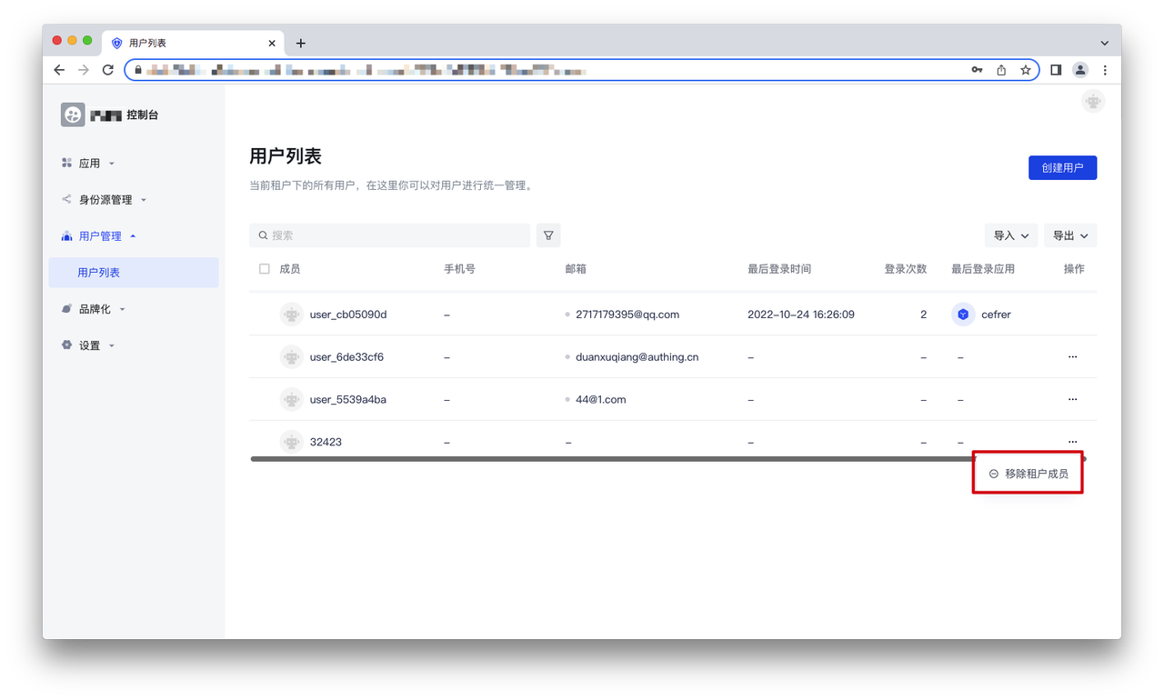 在用户列表右侧可以点击操作按钮,选择「移除租户成员」,在弹窗中点击「移除」,移除后该用户将不在是该租户下的成员,不会出现在用户列表中: