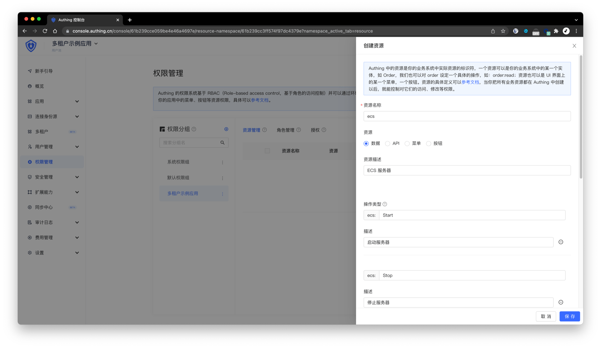 在用户池管理的权限管理页面,选择多租户应用对应的权限分组,点击右上角的「添加资源」按钮,定义我们的业务资源:
